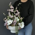 Całoroczna kompozycja kwiatowa, wykonana z kwiatów wysokiej jakości i zielonych dodatków. Całość osadzona w ceramicznej donicy. Kompozycja wykonana jest dość luźno, ma przestrzenny charakter. Stonowana kolorystyka, uzupełniona zielenią liści sprawia, że kompozycja dopasuje się do różnych rodzajów wnętrz. Dekoracja z każdej strony wygląda nieco inaczej. Polecamy do domów prywatnych, ale również do obiektów użyteczności publicznej. Nasze kompozycje to wspaniałe uzupełnienie hotelowych i restauracyjnych wnętrz, a także salonów spa, gabinetów kosmetycznych i lekarskich, klinik i poradni.