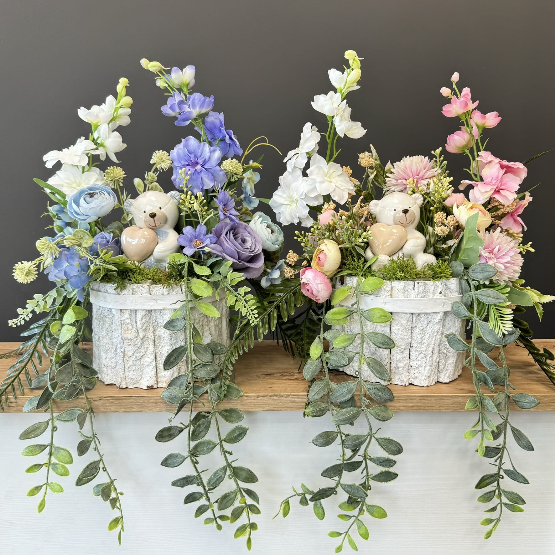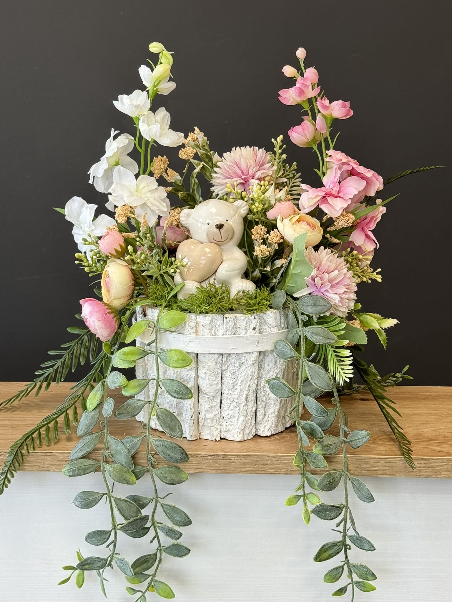 Dekoracja funeralna z ceramicznym misiem osadzona w drewnianej donicy obłożonej korą. Postawa jest obciążona cementem, wypełniona dużą ilością kwiatów, liści i roślinnych dodatków w przepięknej, stonowanej kolorystyce. Szczególnego uroku dodaje jej przepiękny anioł umieszczony w kompozycji.