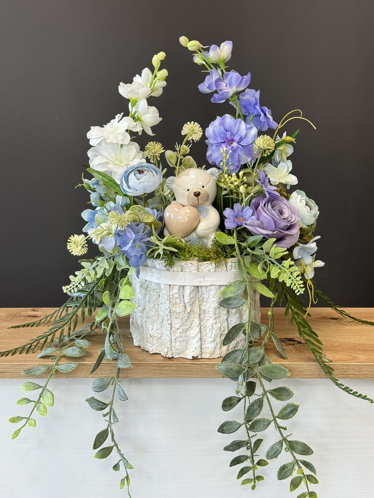 Dekoracja funeralna z ceramicznym misiem osadzona w drewnianej donicy obłożonej korą. Postawa jest obciążona cementem, wypełniona dużą ilością kwiatów, liści i roślinnych dodatków w przepięknej, stonowanej kolorystyce. Szczególnego uroku dodaje jej przepiękny anioł umieszczony w kompozycji.