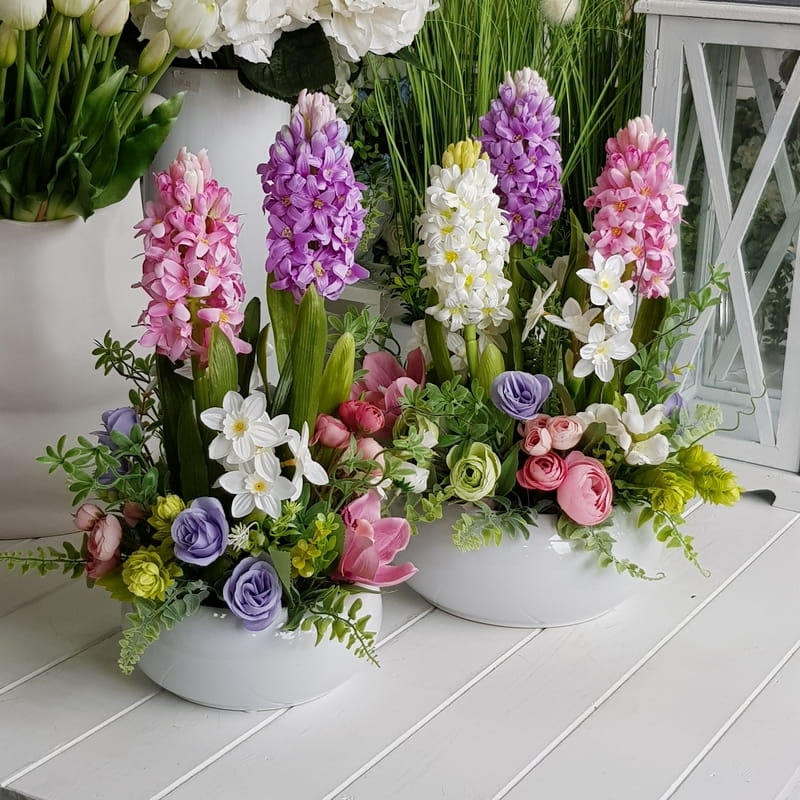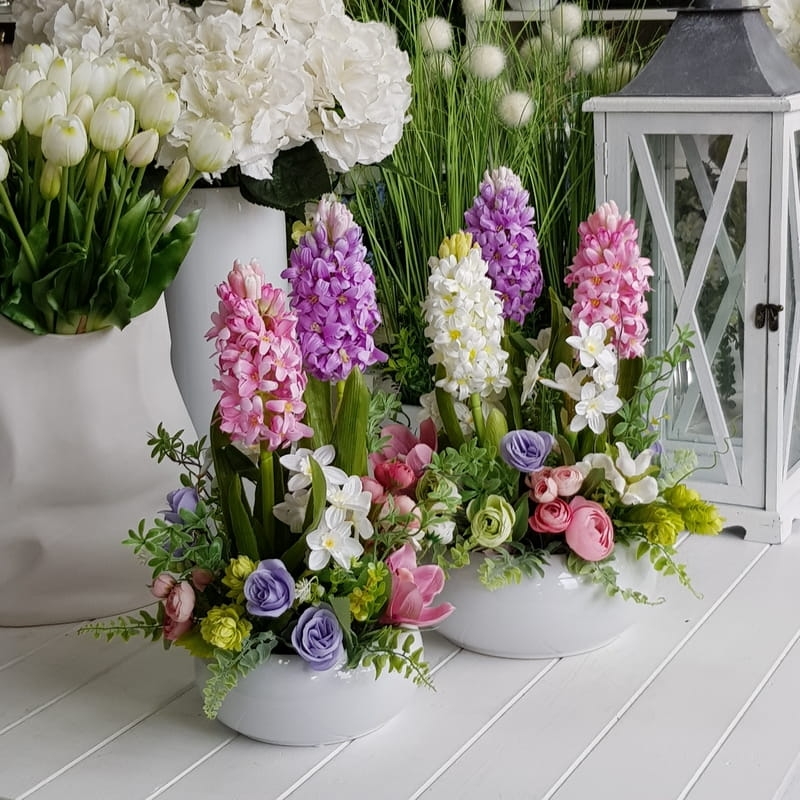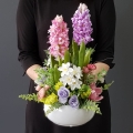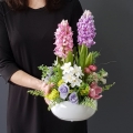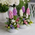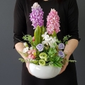Oryginalna kompozycja roślinna z hiacyntami w roli głównej, uzupełniona wiosennymi kwiatami i zielonymi dodatkami, osadzona w ceramicznej donicy. Idealnie sprawdzi się jako ozdoba mieszkań zarówno w stylu klasycznym, jak i nowoczesnym. Pięknie będzie się prezentowała na komodzie czy parapecie.
