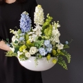 Oryginalna kompozycja roślinna z hiacyntami w roli głównej, uzupełniona wiosennymi kwiatami i zielonymi dodatkami, osadzona w ceramicznej donicy. Idealnie sprawdzi się jako ozdoba mieszkań zarówno w stylu klasycznym, jak i nowoczesnym. Pięknie będzie się prezentowała na komodzie czy parapecie.
