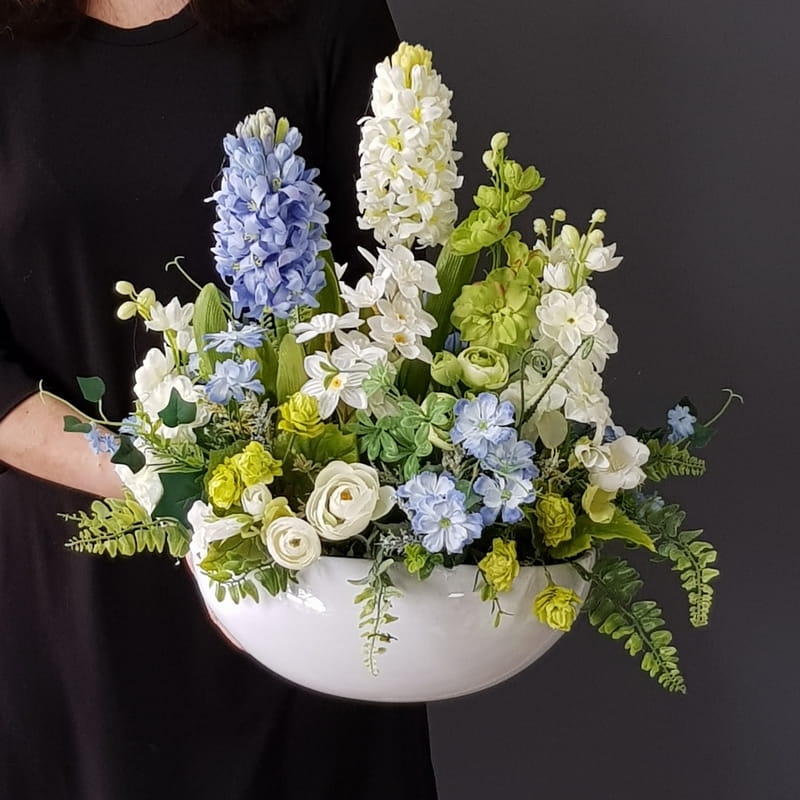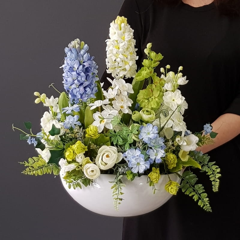 Kompozycja na stół wiosna kwiaty sztuczne hiacynty Benita blue