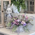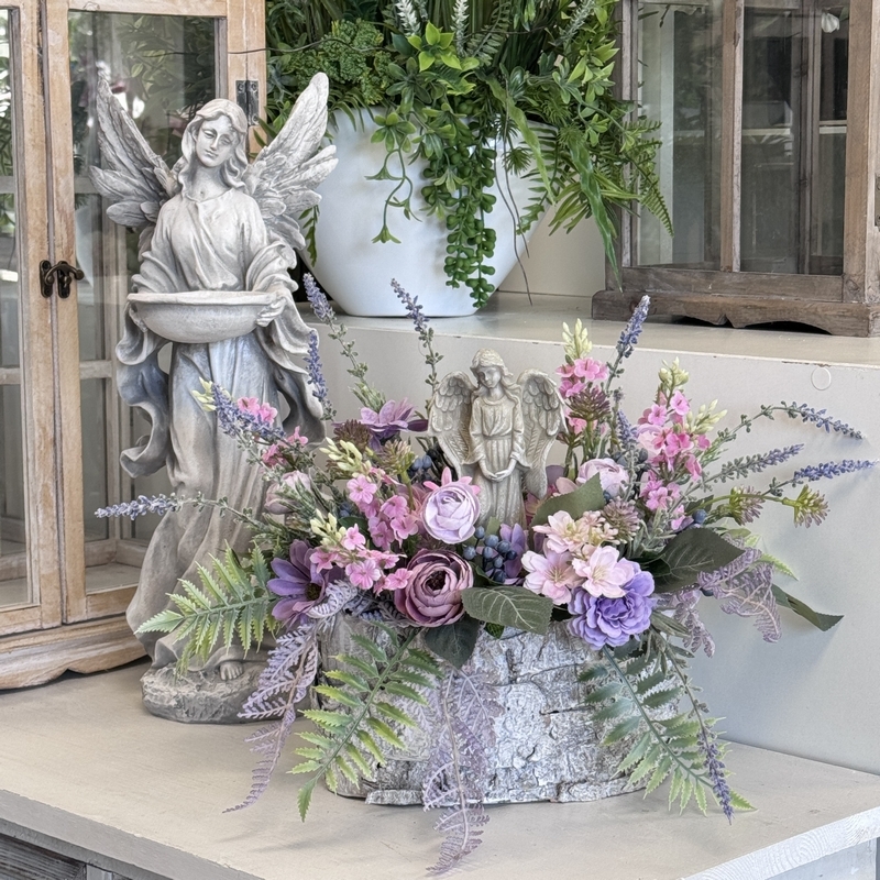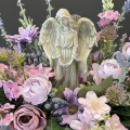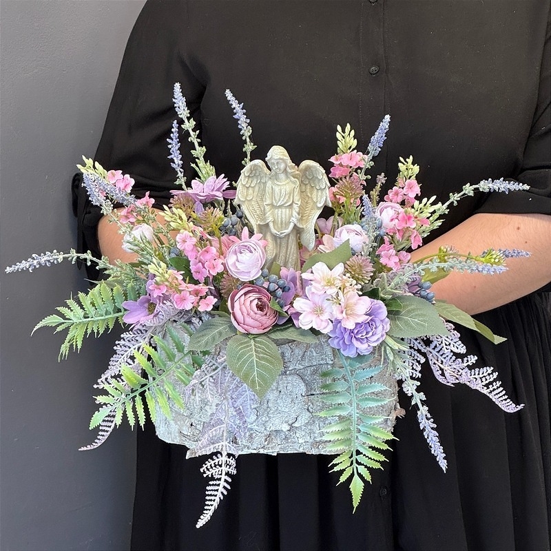 Elegancka, ręcznie wykonana kompozycja nagrobna z figurką anioła – kobiety, osadzona w solidnej drewnianej donicy pokrytej naturalną korą. Stabilna, dzięki odpowiedniemu obciążeniu, a jednocześnie lekka w wyrazie. Kwiaty w odcieniach różu i fioletu nadają aranżacji subtelnego, romantycznego charakteru. Wśród nich znajdziesz m.in. lawendę, drobne polne kwiatki oraz delikatne listki w pudrowej zieleni, które dodają kompozycji świeżości i naturalności.