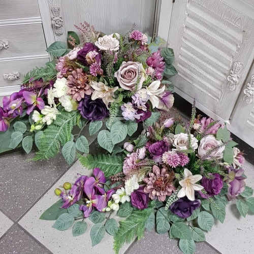 Kompozycja nagrobna wykonana z wysokiej jakości sztucznych kwiatów. Kwiaty umieszczone na podkładzie z tworzywa sztucznego, obciążonego cementem.