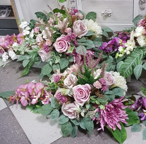 Kompozycja nagrobna wykonana z wysokiej jakości sztucznych kwiatów. Kwiaty umieszczone na podkładzie z tworzywa sztucznego, obciążonego cementem.