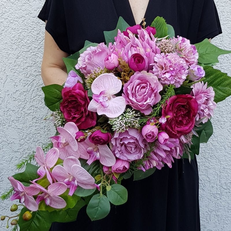 Oryginalna kompozycja nagrobna w kształcie kropli, wykonana z wysokiej jakości roślin sztucznych oraz podstawy z tworzywa sztucznego. Całość jest utrzymana w letniej kolorystyce. Bardzo ładnie będzie się prezentowała zarówno na jasnym grobie, jak również tym w ciemniejszej kolorystyce. Kompozycja jest obciążona cementem, jest ciężka i stabilna. Poszczególne kompozycje mogą się minimalnie różnić układem i rodzajem roślin, w zależności od dostępności. Każda z nich jest wykonana niezwykle starannie, z zachowaniem proporcji i dopracowana w najdrobniejszych szczegółach.