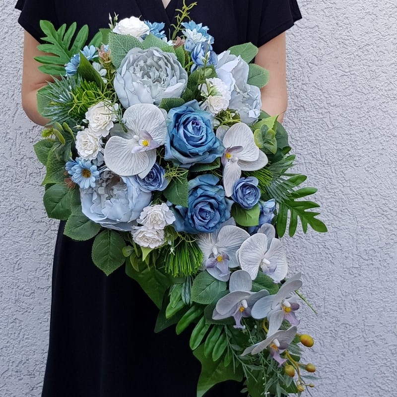 Oryginalna kompozycja nagrobna w kształcie kropli, wykonana z wysokiej jakości roślin sztucznych oraz podstawy z tworzywa sztucznego. Całość jest utrzymana w letniej kolorystyce. Bardzo ładnie będzie się prezentowała zarówno na jasnym grobie, jak również tym w ciemniejszej kolorystyce. Kompozycja jest obciążona cementem, jest ciężka i stabilna. Poszczególne kompozycje mogą się minimalnie różnić układem i rodzajem roślin, w zależności od dostępności. Każda z nich jest wykonana niezwykle starannie, z zachowaniem proporcji i dopracowana w najdrobniejszych szczegółach.