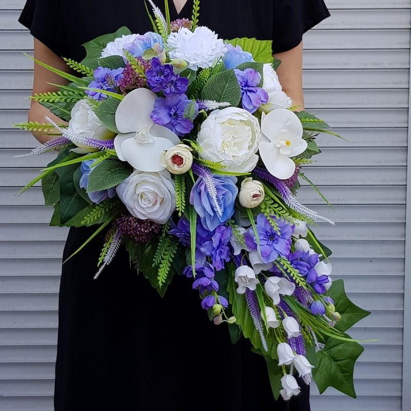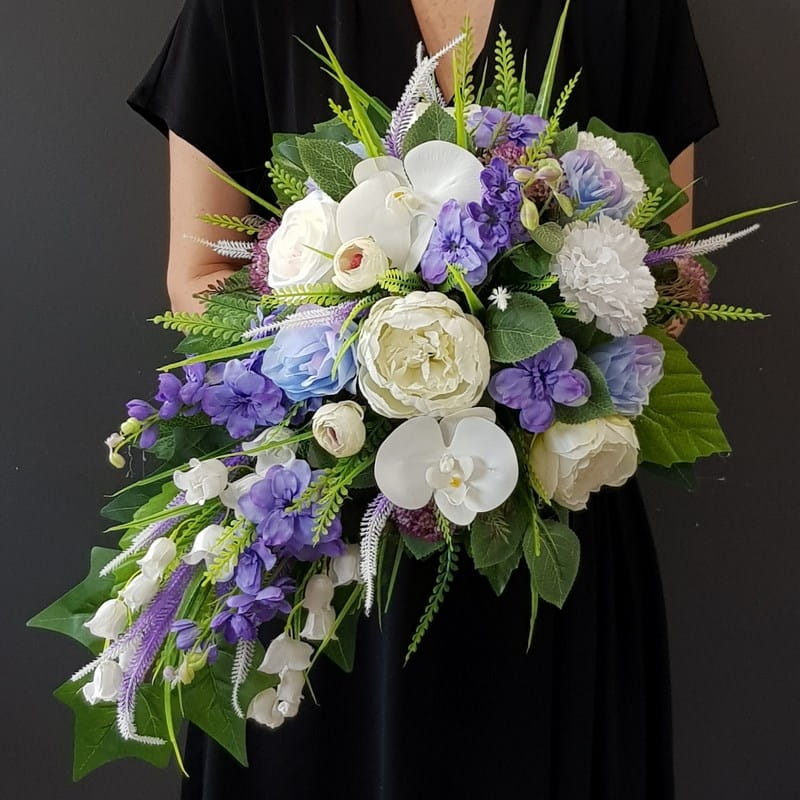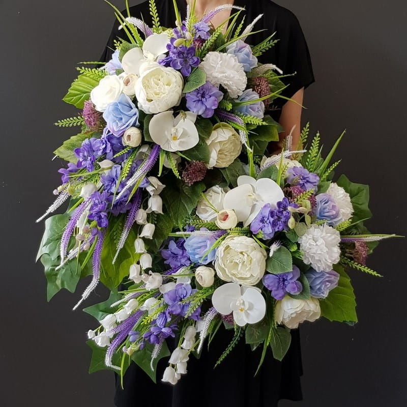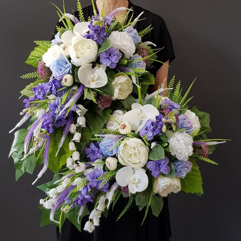 Oryginalna kompozycja nagrobna w kształcie kropli, wykonana z wysokiej jakości roślin sztucznych oraz podstawy z tworzywa sztucznego. Całość jest utrzymana w letniej kolorystyce. Bardzo ładnie będzie się prezentowała zarówno na jasnym grobie, jak również tym w ciemniejszej kolorystyce. Kompozycja jest obciążona cementem, jest ciężka i stabilna. Poszczególne kompozycje mogą się minimalnie różnić układem i rodzajem roślin, w zależności od dostępności. Każda z nich jest wykonana niezwykle starannie, z zachowaniem proporcji i dopracowana w najdrobniejszych szczegółach.