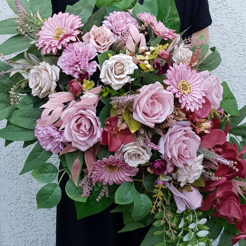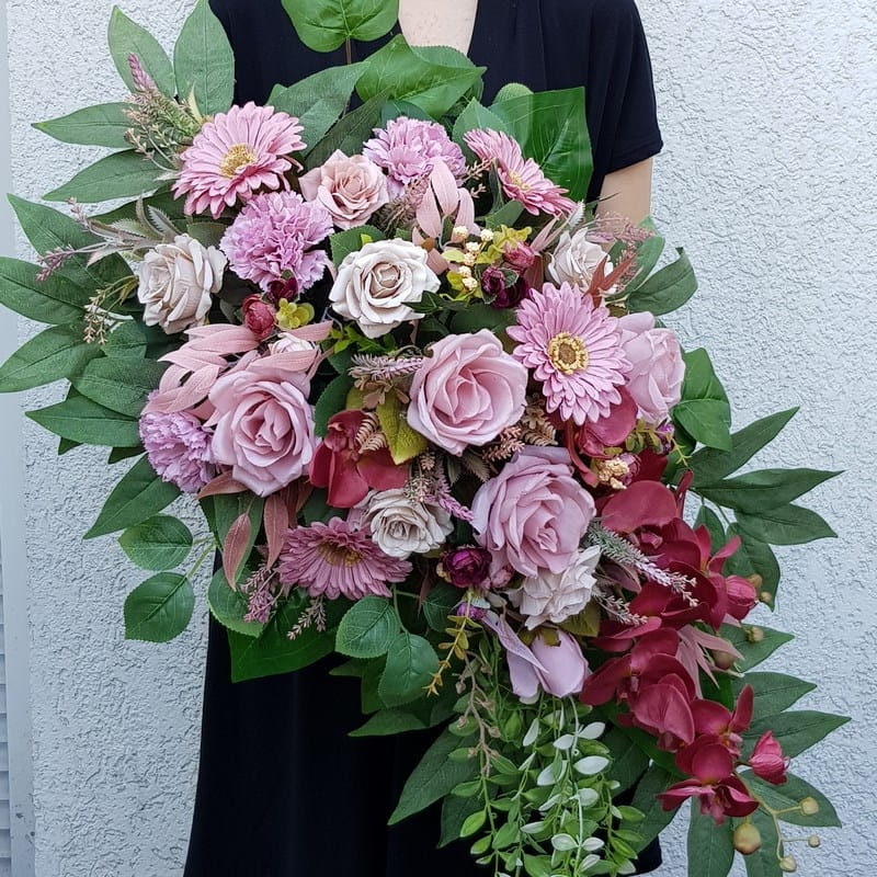 Oryginalna kompozycja nagrobna w kształcie kropli, wykonana z wysokiej jakości roślin sztucznych oraz podstawy z tworzywa sztucznego. Całość jest utrzymana w letniej kolorystyce. Bardzo ładnie będzie się prezentowała zarówno na jasnym grobie, jak również tym w ciemniejszej kolorystyce. Kompozycja jest obciążona cementem, jest ciężka i stabilna. Poszczególne kompozycje mogą się minimalnie różnić układem i rodzajem roślin, w zależności od dostępności. Każda z nich jest wykonana niezwykle starannie, z zachowaniem proporcji i dopracowana w najdrobniejszych szczegółach.