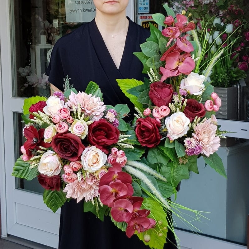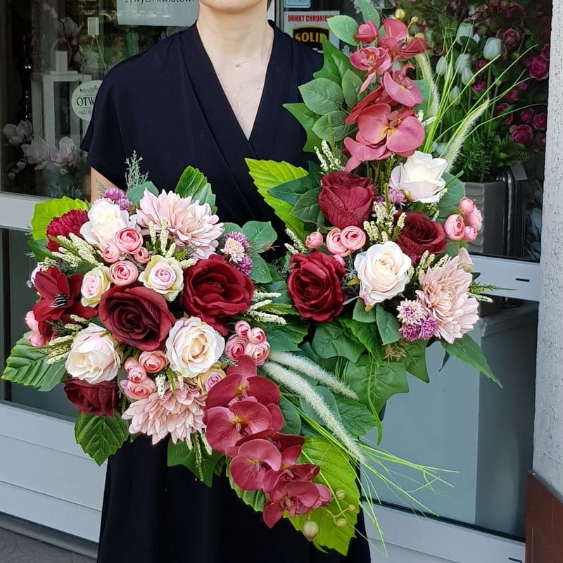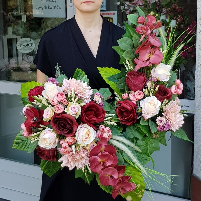 Oryginalna kompozycja nagrobna w kształcie kropli, wykonana z wysokiej jakości roślin sztucznych oraz podstawy z tworzywa sztucznego. Całość jest utrzymana w letniej kolorystyce. Bardzo ładnie będzie się prezentowała zarówno na jasnym grobie, jak również tym w ciemniejszej kolorystyce. Kompozycja jest obciążona cementem, jest ciężka i stabilna. Poszczególne kompozycje mogą się minimalnie różnić układem i rodzajem roślin, w zależności od dostępności. Każda z nich jest wykonana niezwykle starannie, z zachowaniem proporcji i dopracowana w najdrobniejszych szczegółach.