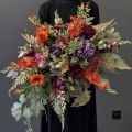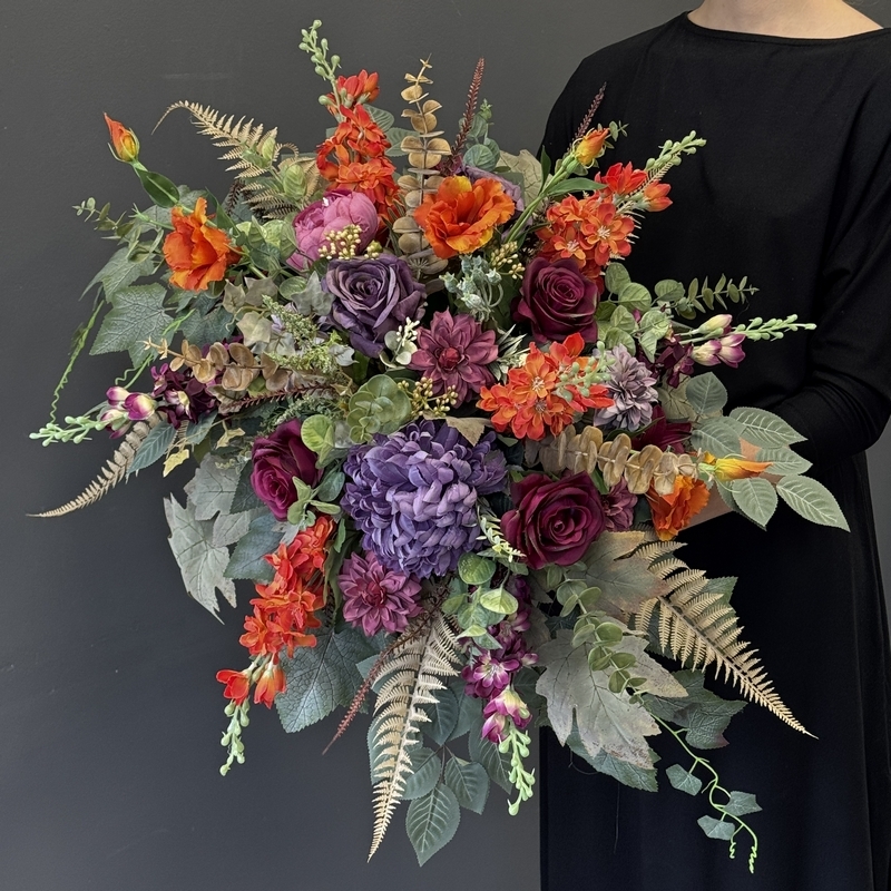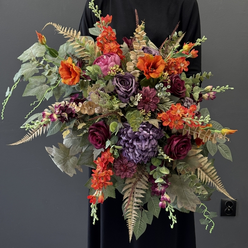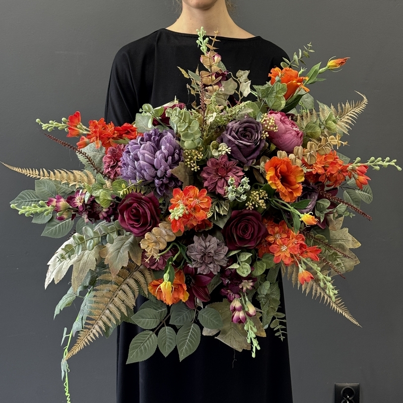 Dekoracja zachwyca bogactwem kwiatów o zróżnicowanych kształtach i fakturach. Wśród nich znaleźć można m.in. efektowne dalie, róże, chryzantemy, ostróżki, eustomy oraz drobne kwiaty uzupełniające, otoczone bujną zielenią i liśćmi o subtelnym wybarwieniu. Na uwagę zasługują również przepiękne liście paproci i eukaliptusa w stonowanej, jesiennej kolorystyce, które nadają charakteru. Całość utrzymana jest w stonowanej, eleganckiej kolorystyce, która idealnie komponuje się z innymi kompozycjami z tej serii. Kompozycja ma przestrzenną, pełną formę – kwiaty ułożono warstwowo, tworząc naturalny i harmonijny układ, który pięknie prezentuje się na nagrobku przez cały sezon.