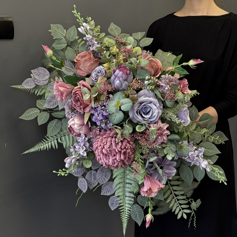 Dekoracja zachwyca bogactwem kwiatów o zróżnicowanych kształtach i fakturach. Wśród nich znaleźć można m.in. efektowne dalie, róże, chryzantemy, ostróżki, eustomy oraz drobne kwiaty uzupełniające, otoczone bujną zielenią i liśćmi o subtelnym wybarwieniu. Na uwagę zasługują również przepiękne liście paproci i eukaliptusa w stonowanej, jesiennej kolorystyce, które nadają charakteru. Całość utrzymana jest w stonowanej, eleganckiej kolorystyce, która idealnie komponuje się z innymi kompozycjami z tej serii. Kompozycja ma przestrzenną, pełną formę – kwiaty ułożono warstwowo, tworząc naturalny i harmonijny układ, który pięknie prezentuje się na nagrobku przez cały sezon.