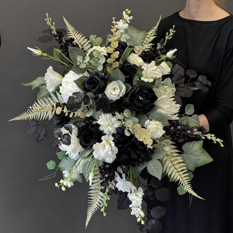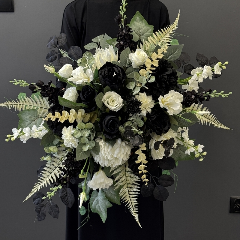 Dekoracja zachwyca bogactwem kwiatów o zróżnicowanych kształtach i fakturach. Wśród nich znaleźć można m.in. efektowne dalie, róże, chryzantemy, ostróżki, eustomy oraz drobne kwiaty uzupełniające, otoczone bujną zielenią i liśćmi o subtelnym wybarwieniu. Na uwagę zasługują również przepiękne liście paproci i eukaliptusa w stonowanej, jesiennej kolorystyce, które nadają charakteru. Całość utrzymana jest w stonowanej, eleganckiej kolorystyce, która idealnie komponuje się z innymi kompozycjami z tej serii. Kompozycja ma przestrzenną, pełną formę – kwiaty ułożono warstwowo, tworząc naturalny i harmonijny układ, który pięknie prezentuje się na nagrobku przez cały sezon.