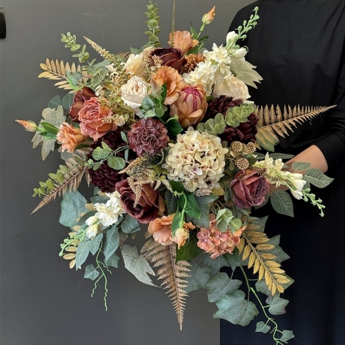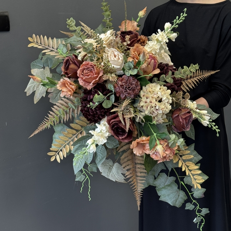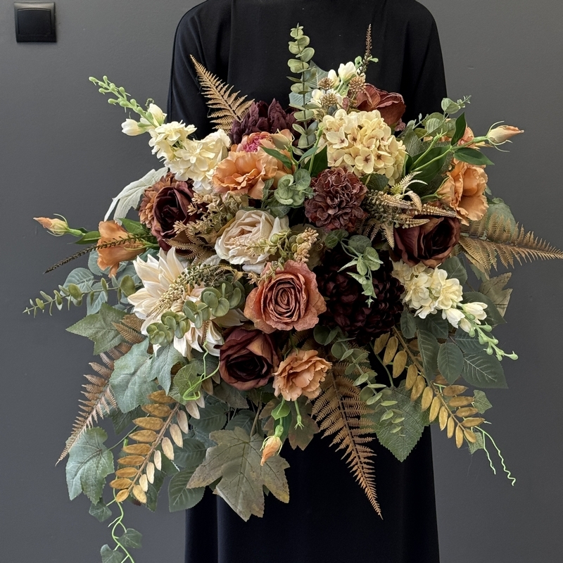 Dekoracja zachwyca bogactwem kwiatów o zróżnicowanych kształtach i fakturach. Wśród nich znaleźć można m.in. efektowne dalie, róże, chryzantemy, ostróżki, eustomy oraz drobne kwiaty uzupełniające, otoczone bujną zielenią i liśćmi o subtelnym wybarwieniu. Na uwagę zasługują również przepiękne liście paproci i eukaliptusa w stonowanej, jesiennej kolorystyce, które nadają charakteru. Całość utrzymana jest w stonowanej, eleganckiej kolorystyce, która idealnie komponuje się z innymi kompozycjami z tej serii. Kompozycja ma przestrzenną, pełną formę – kwiaty ułożono warstwowo, tworząc naturalny i harmonijny układ, który pięknie prezentuje się na nagrobku przez cały sezon.