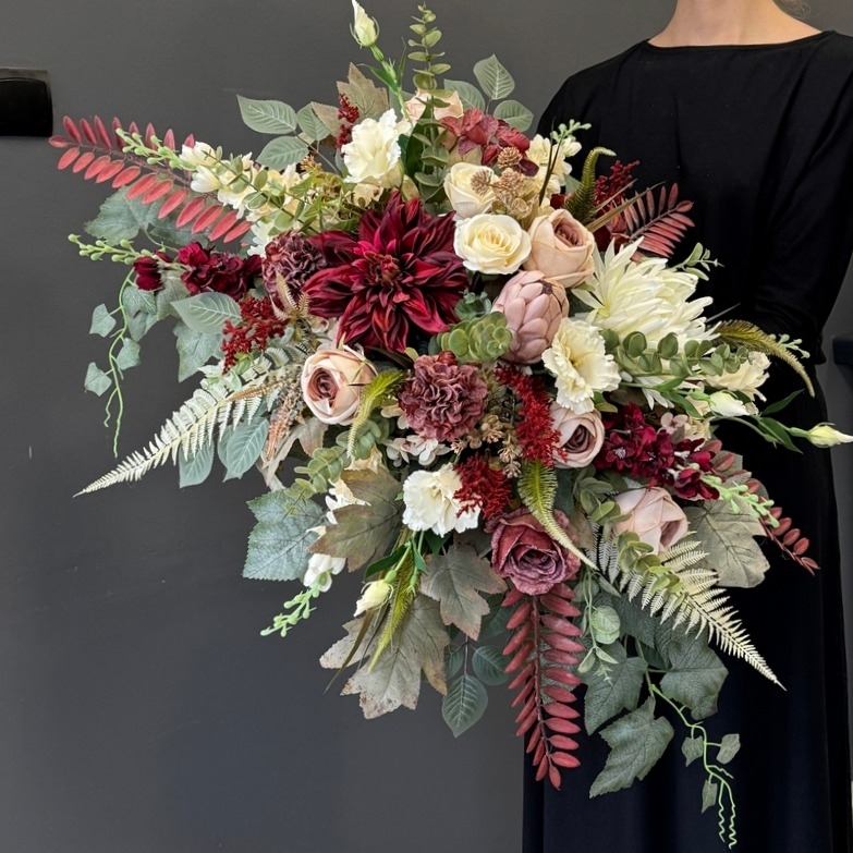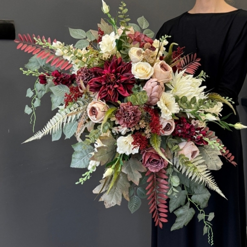Dekoracja zachwyca bogactwem kwiatów o zróżnicowanych kształtach i fakturach. Wśród nich znaleźć można m.in. efektowne dalie, róże, chryzantemy, ostróżki, eustomy oraz drobne kwiaty uzupełniające, otoczone bujną zielenią i liśćmi o subtelnym wybarwieniu. Na uwagę zasługują również przepiękne liście paproci i eukaliptusa w stonowanej, jesiennej kolorystyce, które nadają charakteru. Całość utrzymana jest w stonowanej, eleganckiej kolorystyce, która idealnie komponuje się z innymi kompozycjami z tej serii. Kompozycja ma przestrzenną, pełną formę – kwiaty ułożono warstwowo, tworząc naturalny i harmonijny układ, który pięknie prezentuje się na nagrobku przez cały sezon.