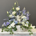 Dekoracja funeralna w postaci donicy, wypełnionej pięknymi kwiatami. Wśród nich znajdują się kwiaty eustomy, ostóżki, pełniki, storczyk tajlandzki, lawenda przepięknie współgrające kolorystycznie. Postawa wykonana z drewna obłożonego dekoracyjną korą, dodatkowo obciążona jest cementem. Szczególnego uroku dodaje jej figura ceramicznego anioła symbolizującego pamięć i miłość.