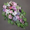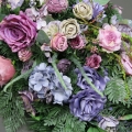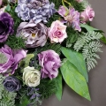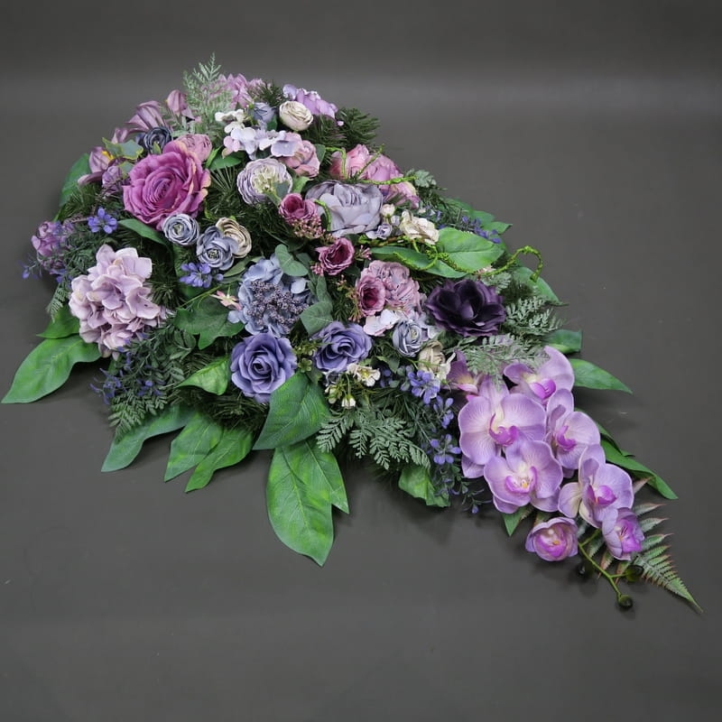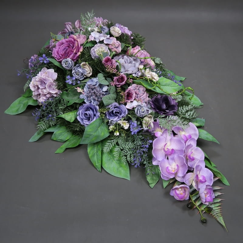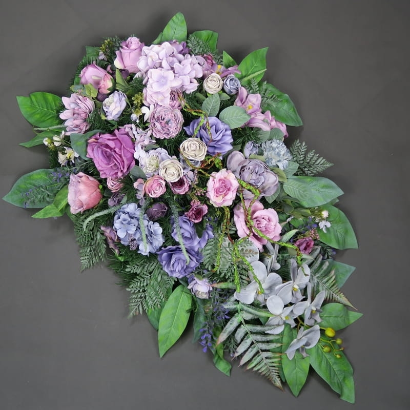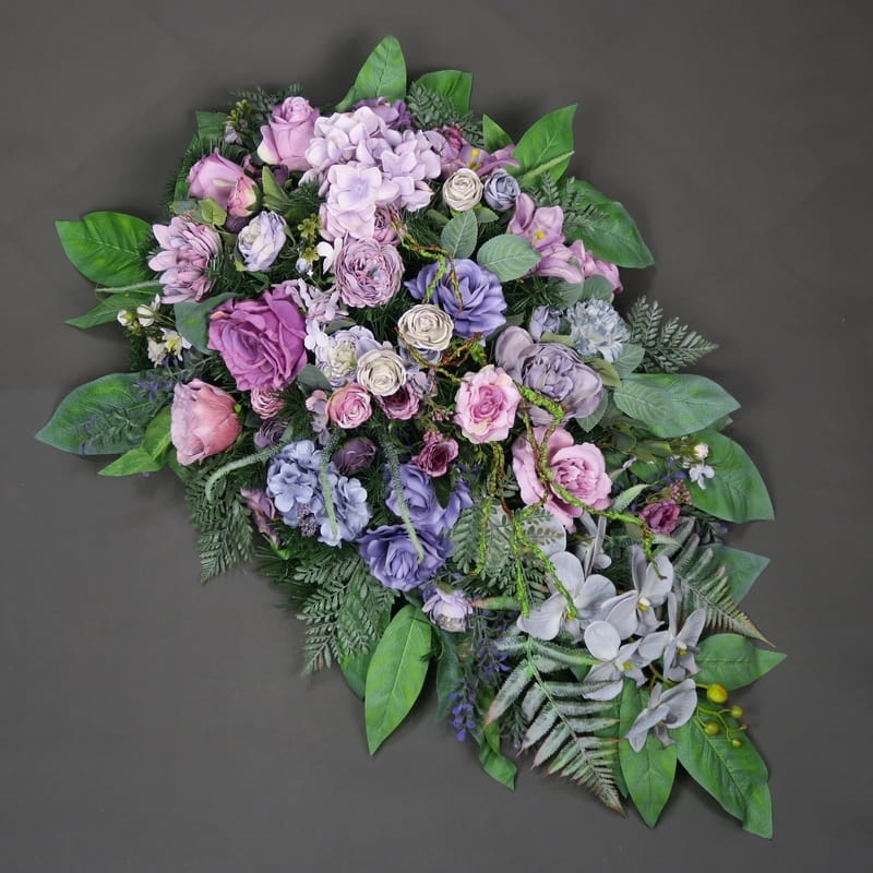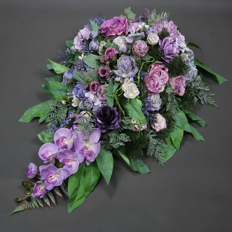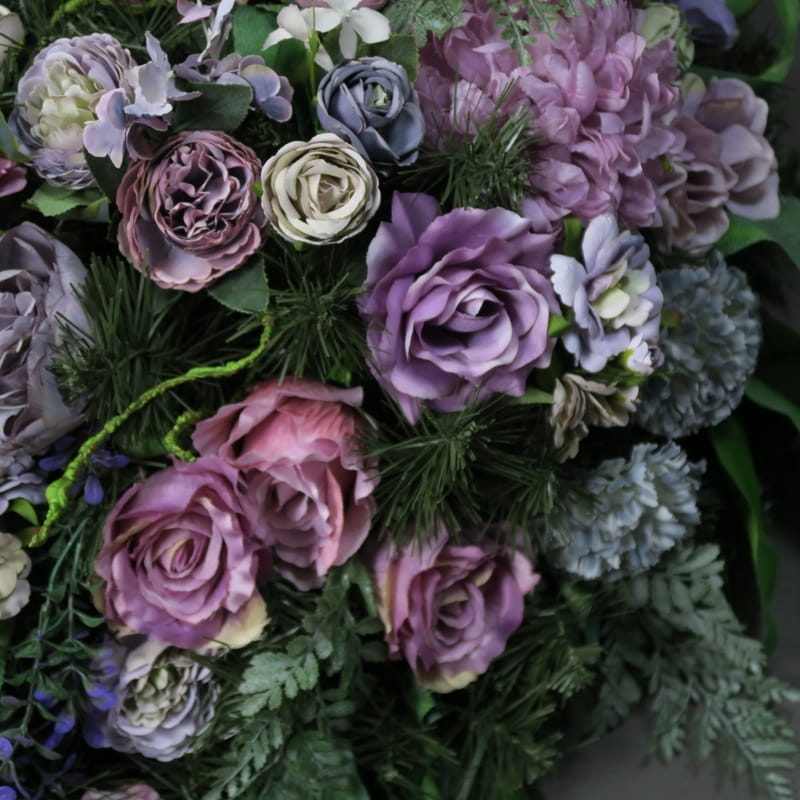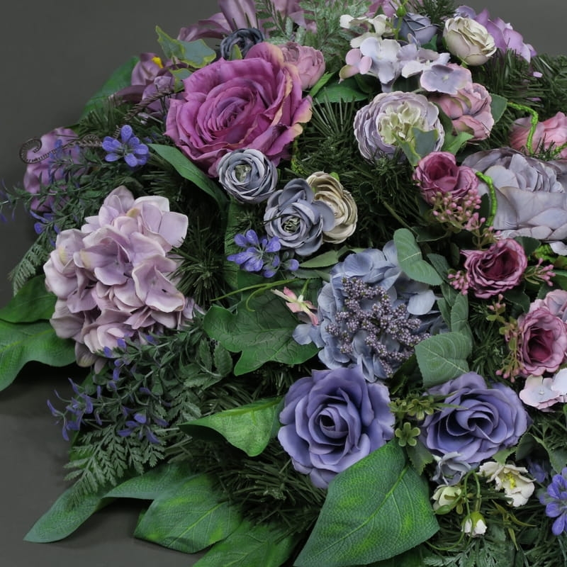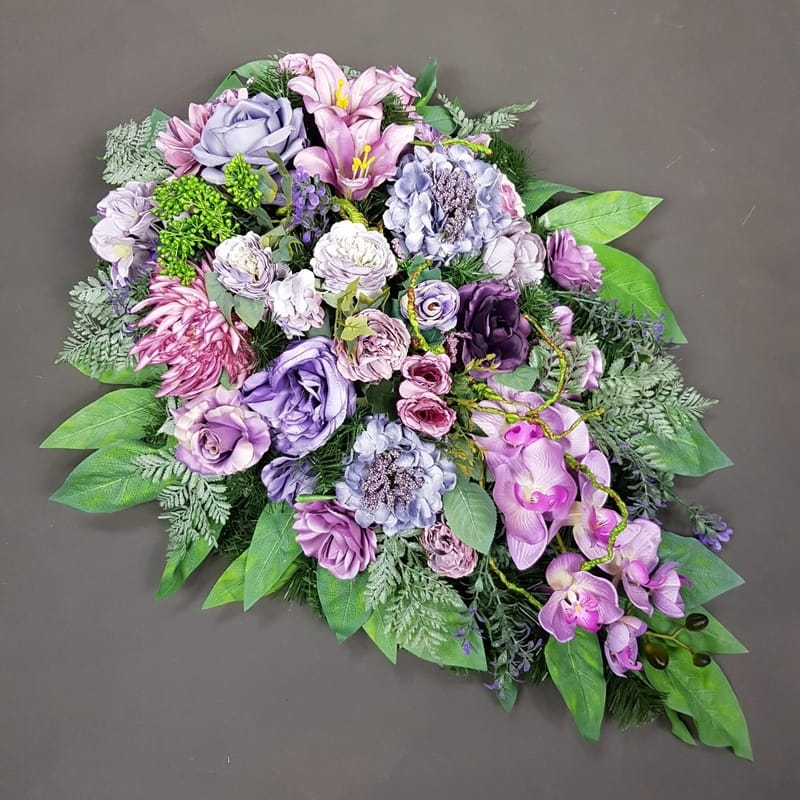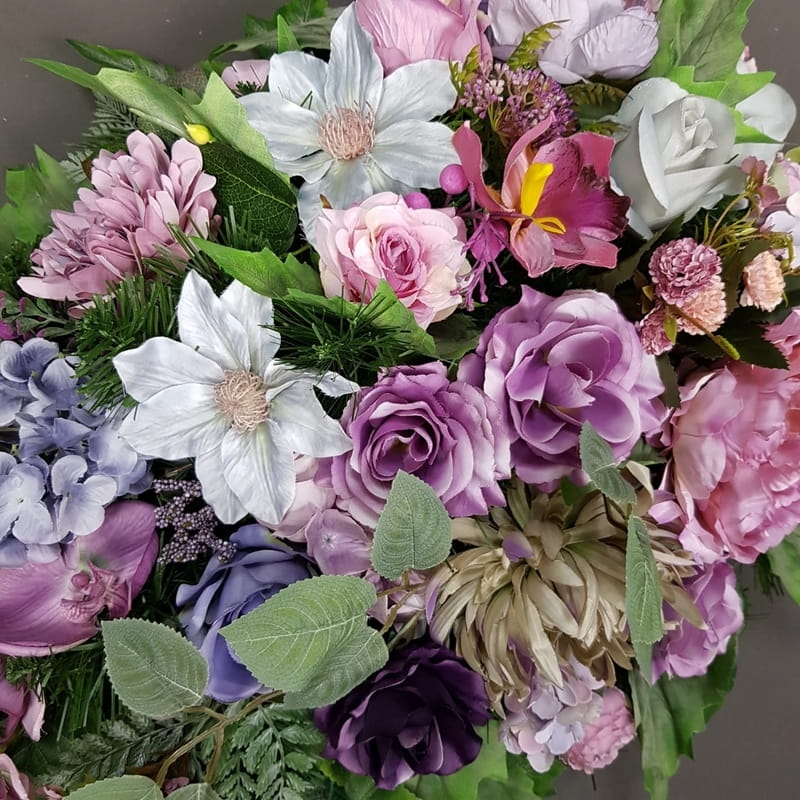 Kompozycja nagrobna wykonana z wysokiej jakości sztucznych kwiatów. Utrzymana w kolorystyce fioletowo różowej. Kwiaty umieszczone na podkładzie ze sztucznego świerku.