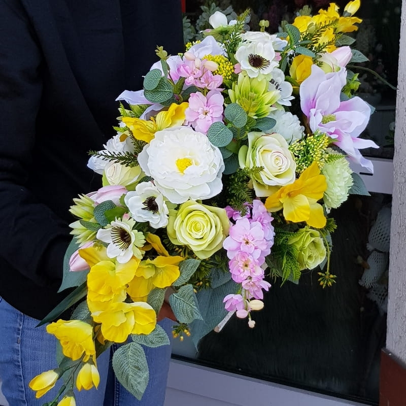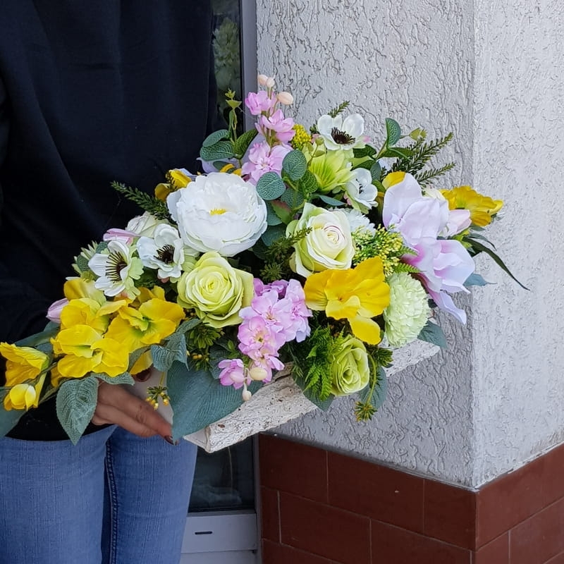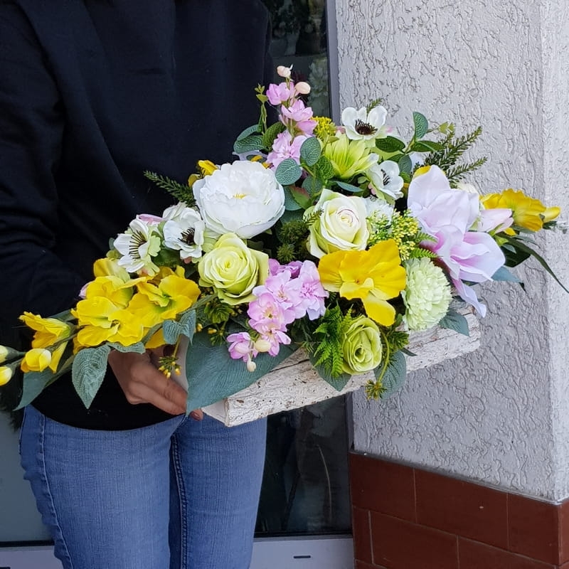 Oryginalna kompozycja nagrobna, wykonana z wysokiej jakości roślin sztucznych oraz donica z drewna, obciążona betonem.