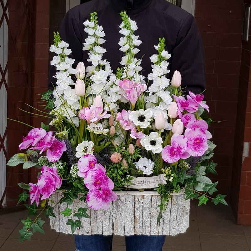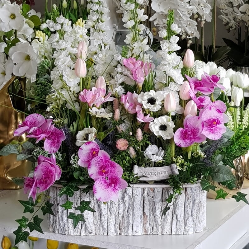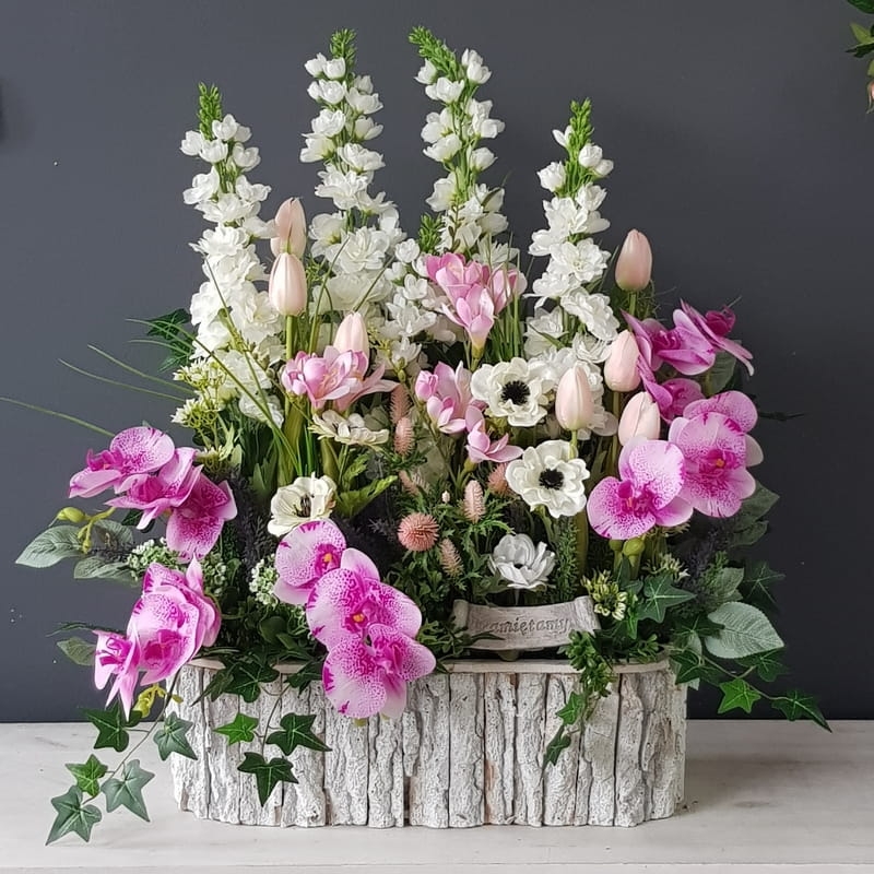 Oryginalna kompozycja nagrobna, wykonana z wysokiej jakości roślin sztucznych oraz donicy drewnianej wysokiej jakości, obciążona.