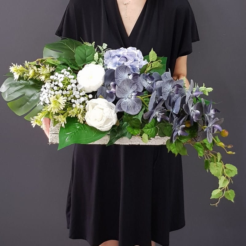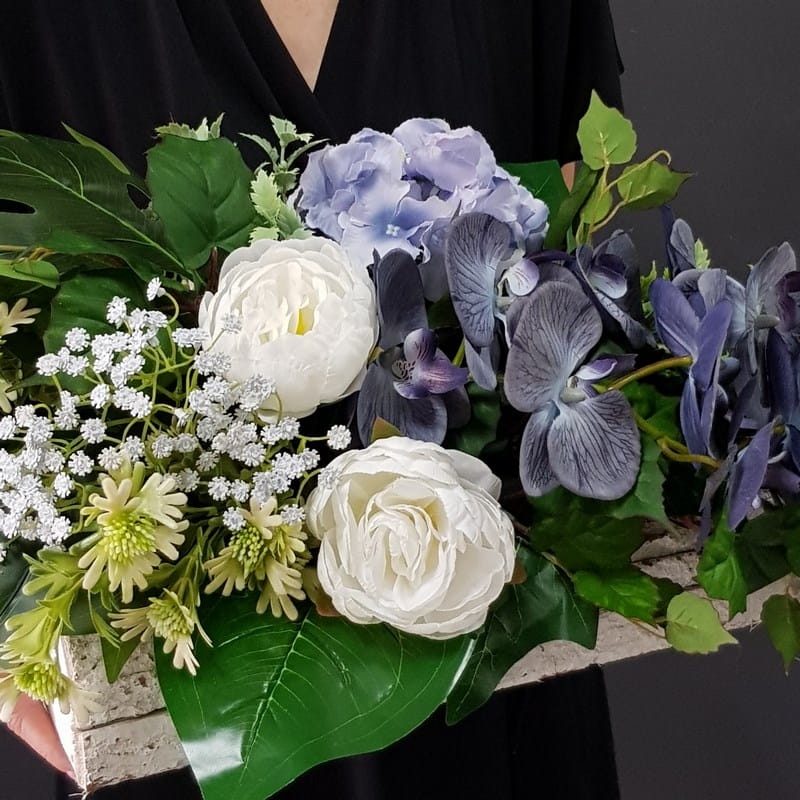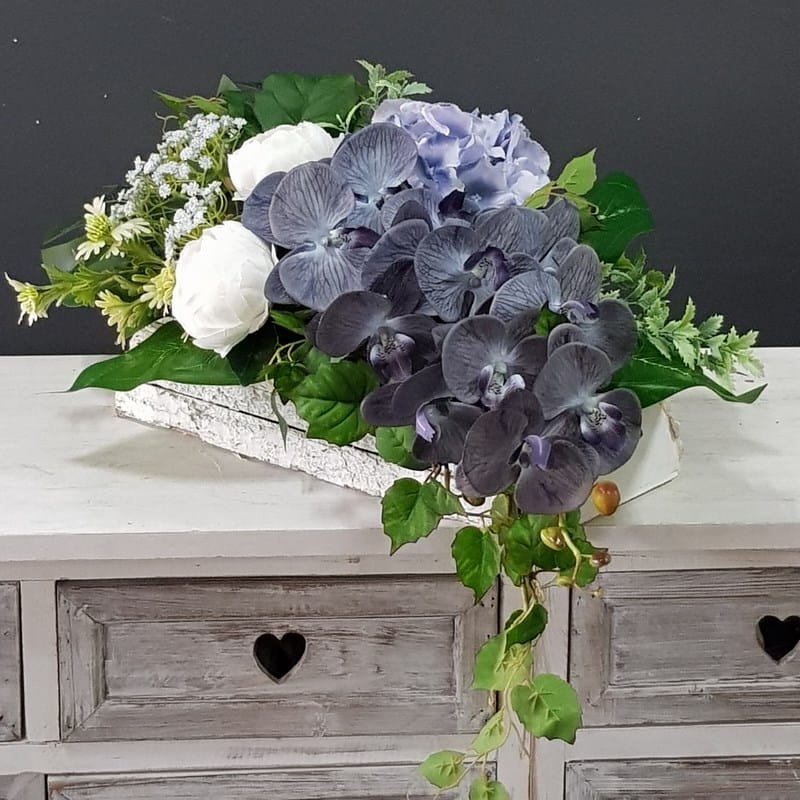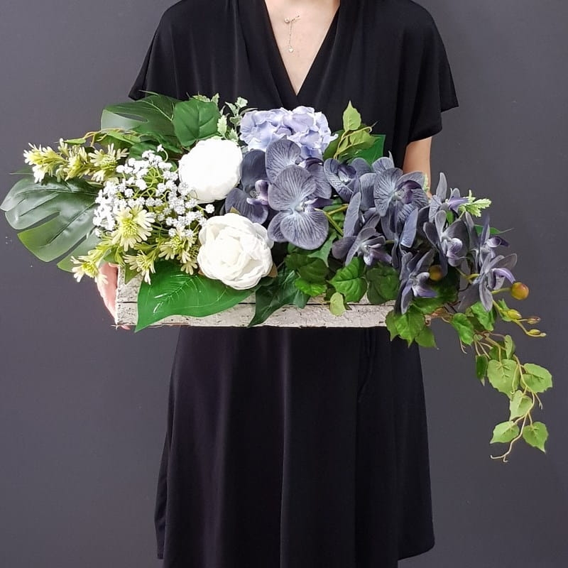 Nowoczesna kompozycja nagrobna o wydłużonym kształcie, wypełniona kwiatami i zielonymi dodatkami. Podstawę stanowi drewniana donica z kory, obciążona cementem. Kompozycja została ozdobiona dekoracyjnym sznurem. Wykonana z wysokiej jakości sztucznych roślin i dodatków. Wszystkie elementy są idealnie dopasowane kolorystycznie tak, aby tworzyły spójną całość. Kompozycja sprawdzi się jako wyjątkowa i niebanalna dekoracja nagrobna.