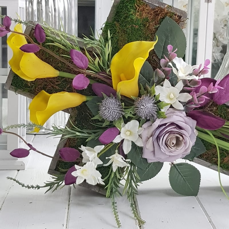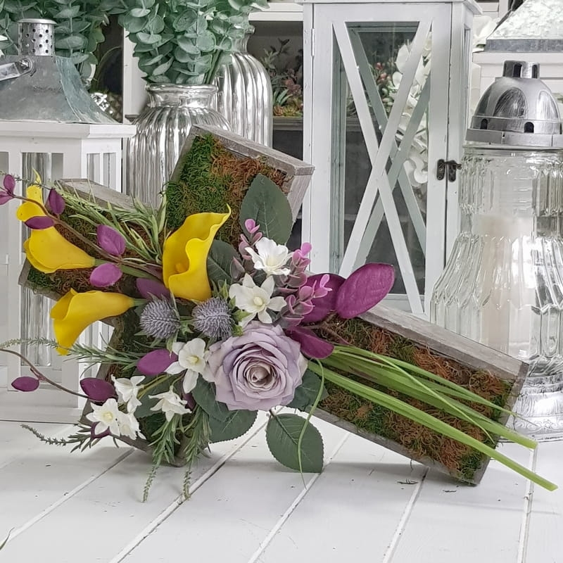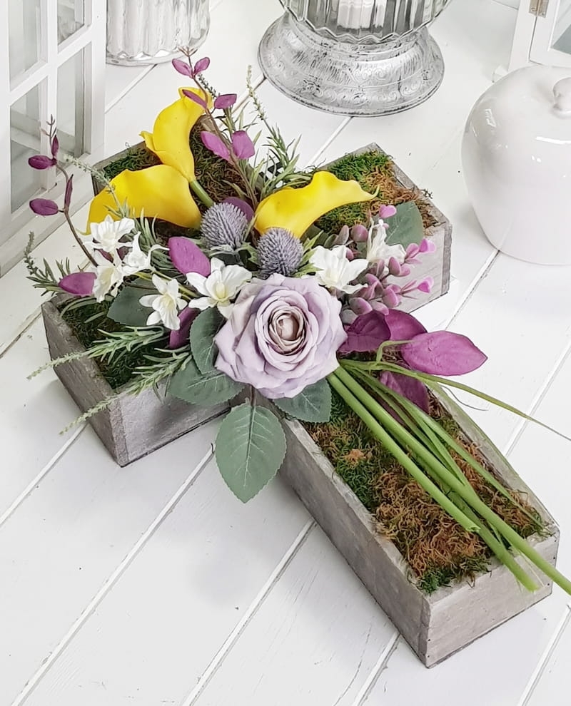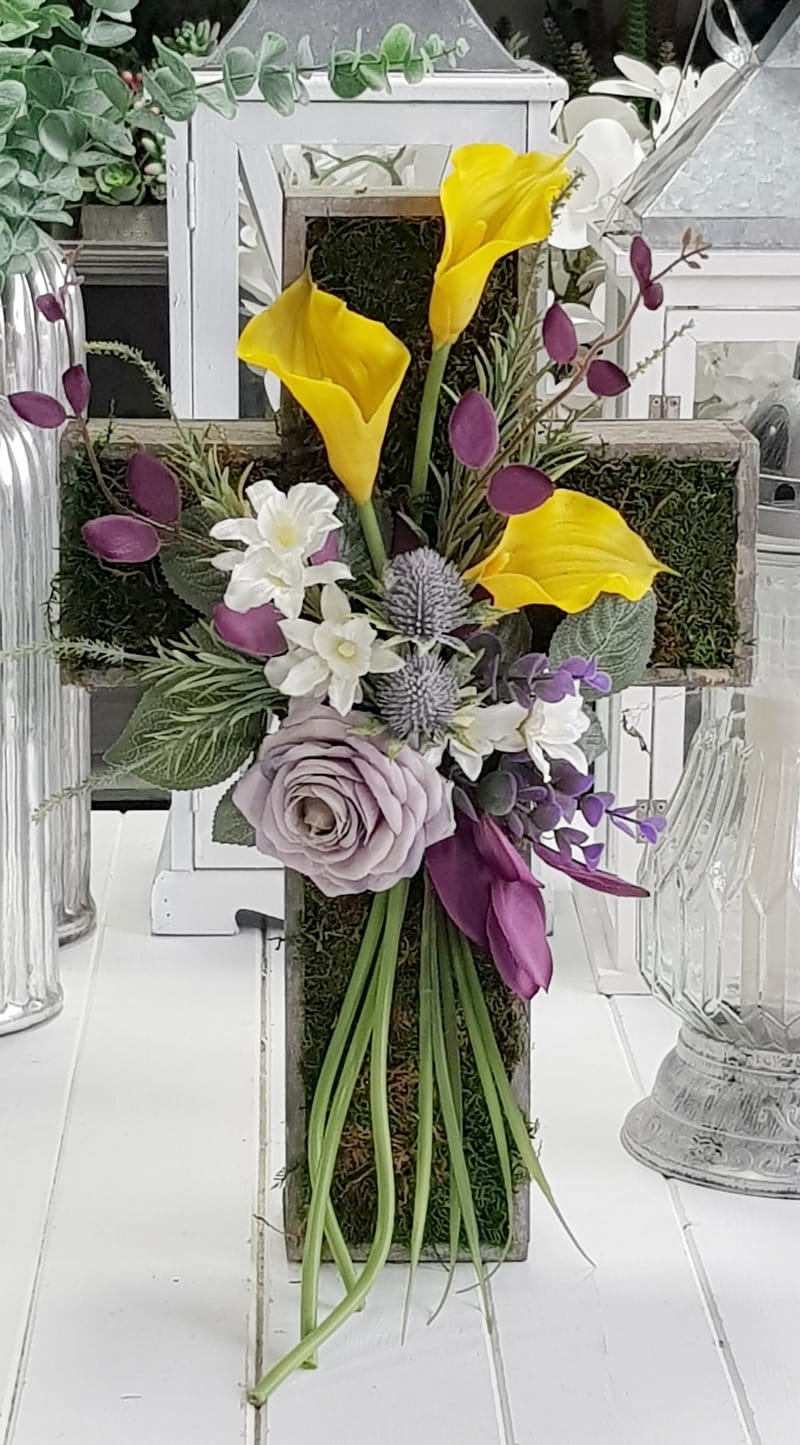 Oryginalna kompozycja nagrobna w kształcie drewnianego krzyża, ozdobionego kwiatami i zielonymi dodatkami. Wykonana z wysokiej jakości roślin sztucznych. Wszystkie elementy są idealnie dopasowane kolorystycznie tak, aby tworzyły spójną całość. Kompozycja sprawdzi się jako wyjątkowa i niebanalna dekoracja nagrobna.