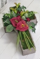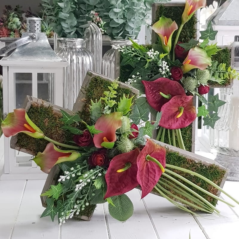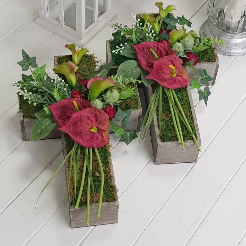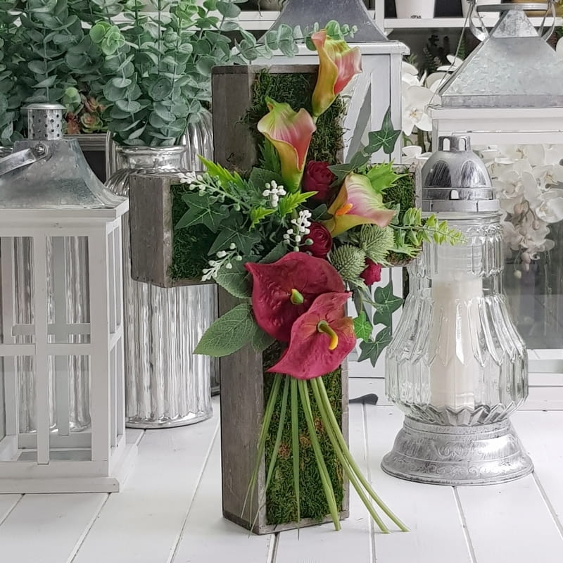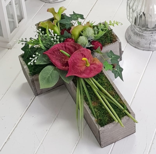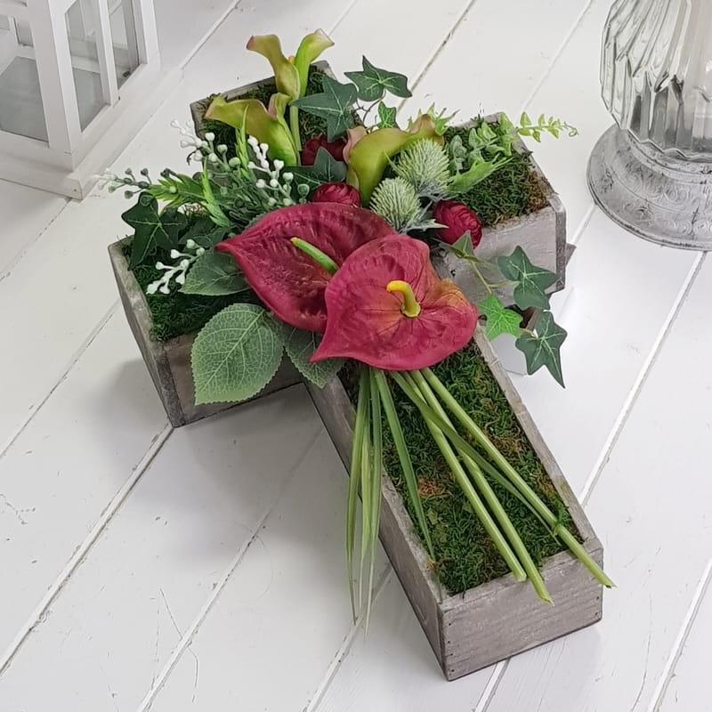 Oryginalna kompozycja nagrobna w kształcie drewnianego krzyża, ozdobionego kwiatami i zielonymi dodatkami. Wykonana z wysokiej jakości roślin sztucznych. Wszystkie elementy są idealnie dopasowane kolorystycznie tak, aby tworzyły spójną całość. Kompozycja sprawdzi się jako wyjątkowa i niebanalna dekoracja nagrobna.