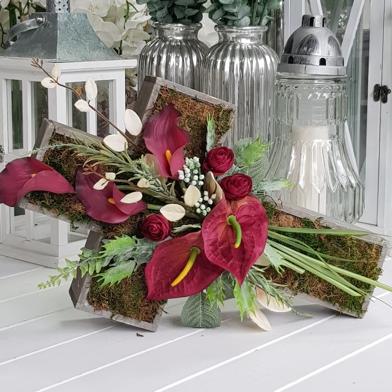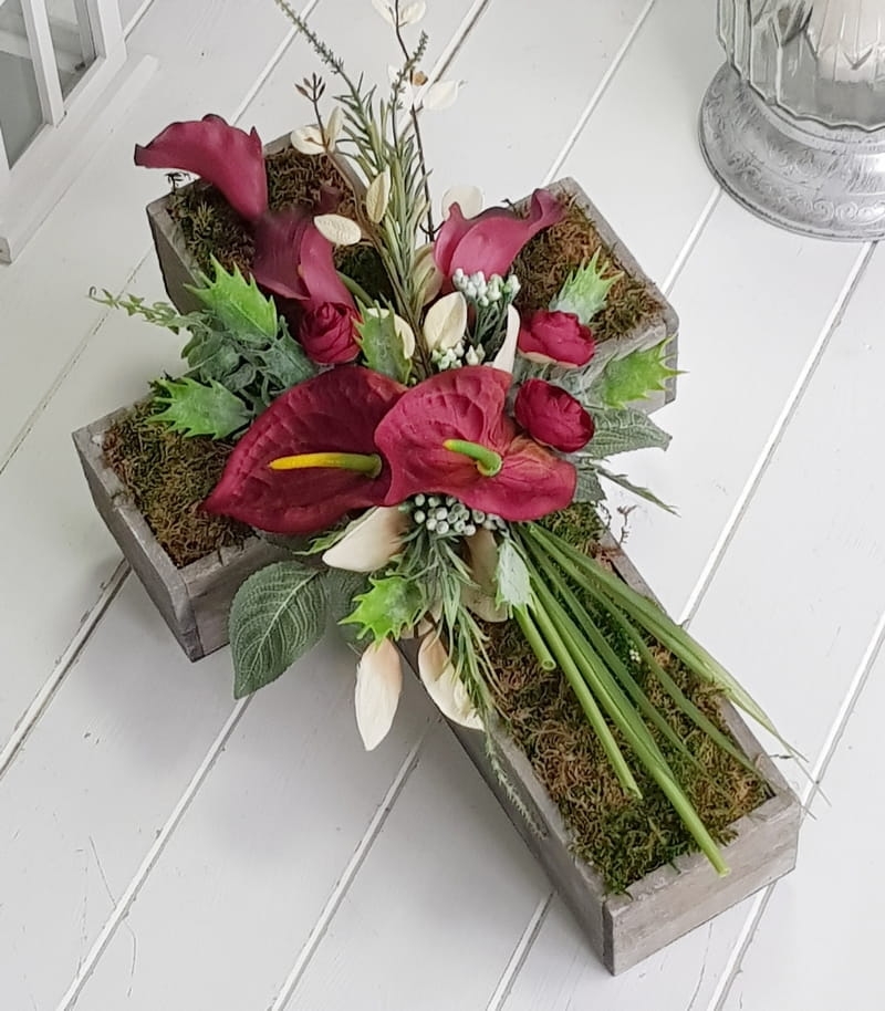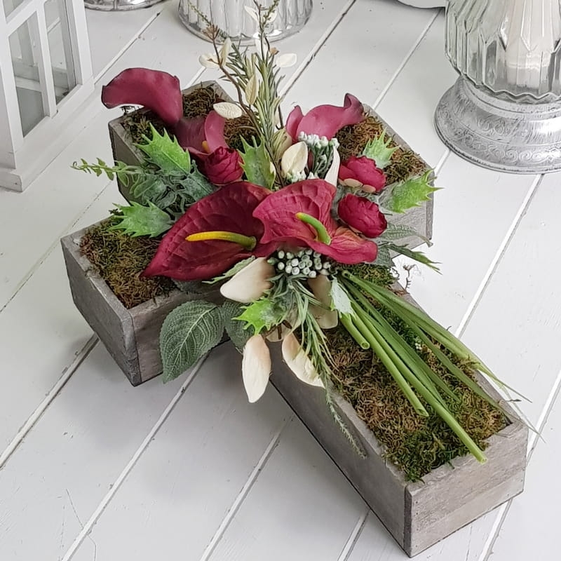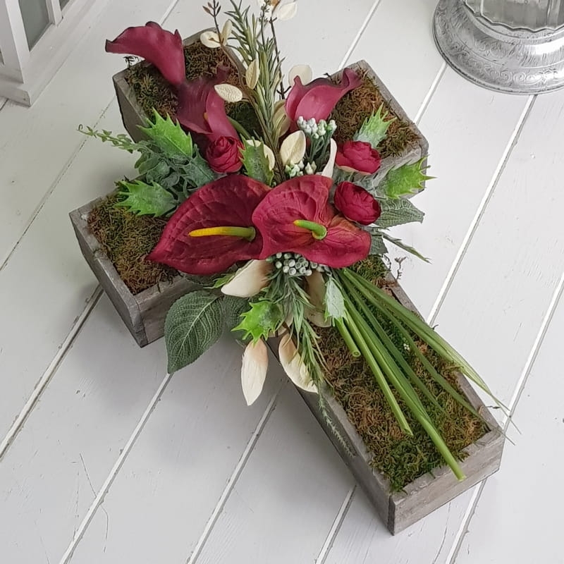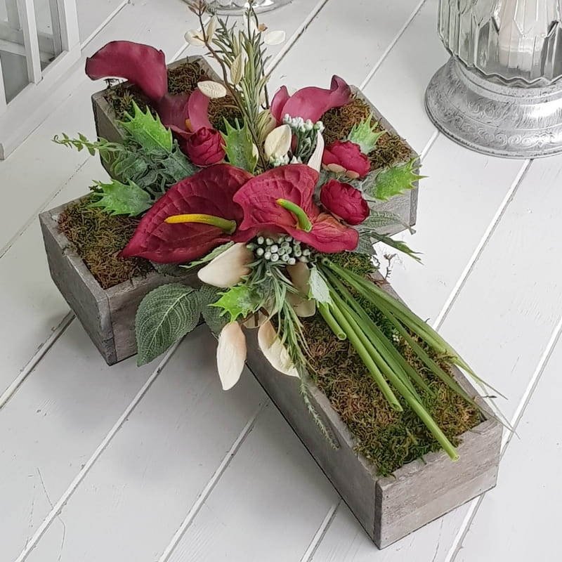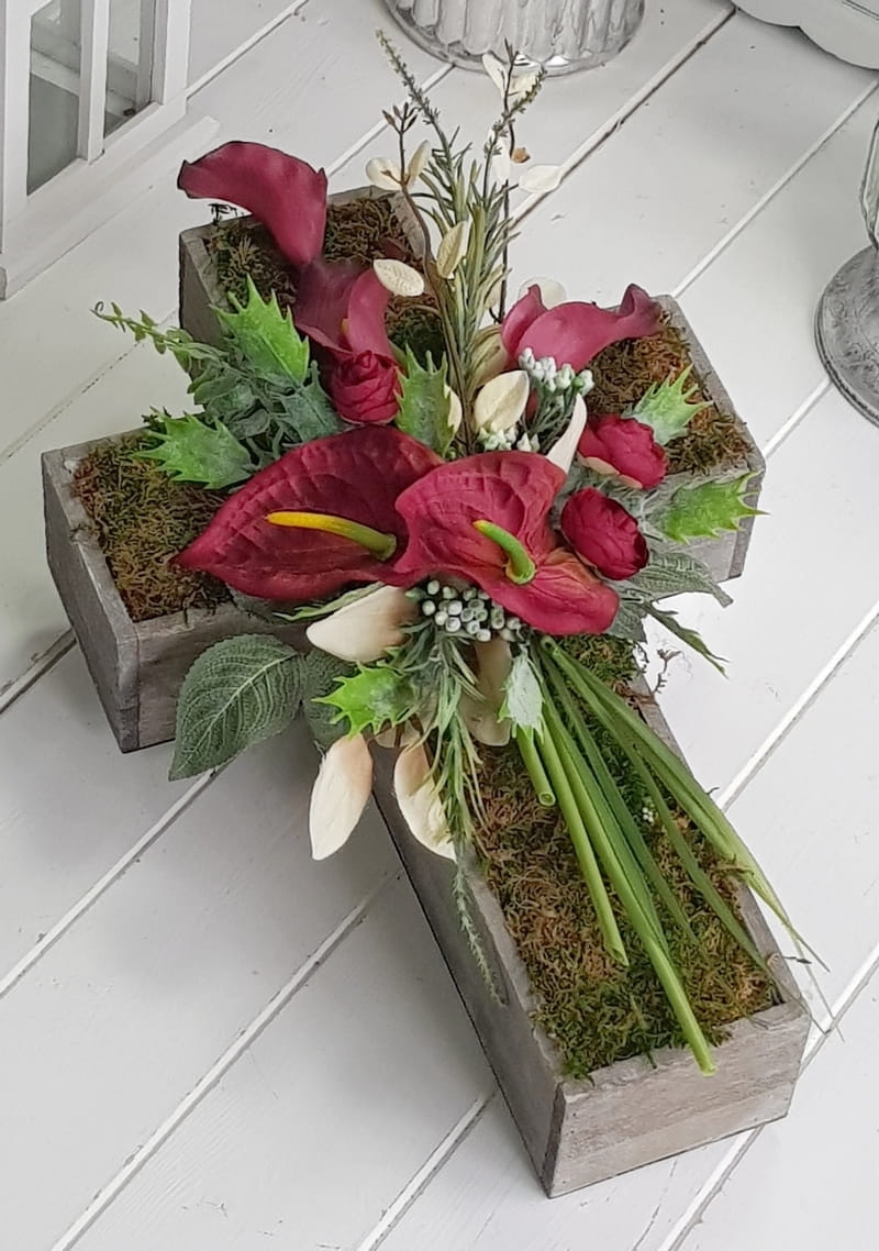 Oryginalna kompozycja nagrobna w kształcie drewnianego krzyża, ozdobionego kwiatami i zielonymi dodatkami. Wykonana z wysokiej jakości roślin sztucznych. Wszystkie elementy są idealnie dopasowane kolorystycznie tak, aby tworzyły spójną całość. Kompozycja sprawdzi się jako wyjątkowa i niebanalna dekoracja nagrobna.
