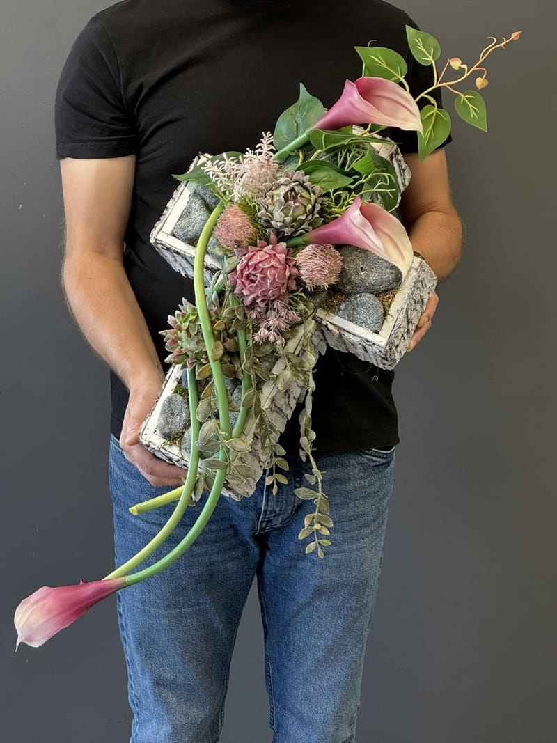Oryginalna kompozycja nagrobna w kształcie drewnianego krzyża, ozdobionego kwiatami i zielonymi dodatkami. Wykonana z wysokiej jakości roślin sztucznych. Wszystkie elementy są idealnie dopasowane kolorystycznie tak, aby tworzyły spójną całość. Kompozycja sprawdzi się jako wyjątkowa i niebanalna dekoracja nagrobna.