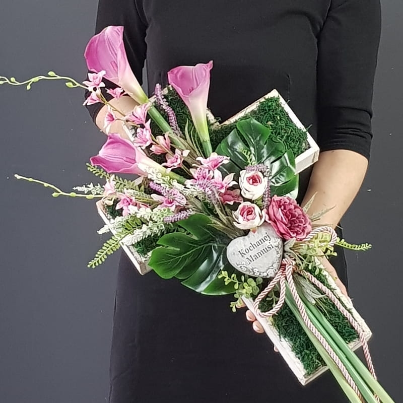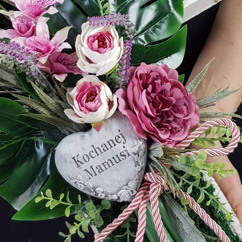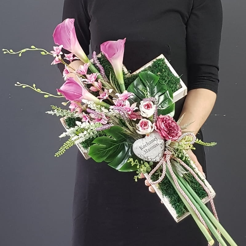 Oryginalna kompozycja nagrobna w kształcie drewnianego krzyża, ozdobionego kwiatami i zielonymi dodatkami. Wykonana z wysokiej jakości roślin sztucznych. Wszystkie elementy są idealnie dopasowane kolorystycznie tak, aby tworzyły spójną całość. Kompozycja sprawdzi się jako wyjątkowa i niebanalna dekoracja nagrobna.