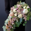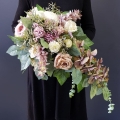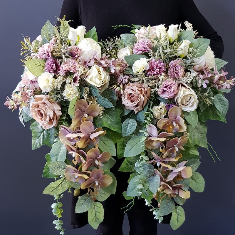 Kompozycja nagrobna w odcieniach cappuccino, brzoskwini, brudnego różu, pastelowego fioletu, przełamana delikatnymi, kremowymi akcentami i uzupełniona pudrową zielenią liści. Całość jest niezwykle elegancka, spokojna i wyważona.