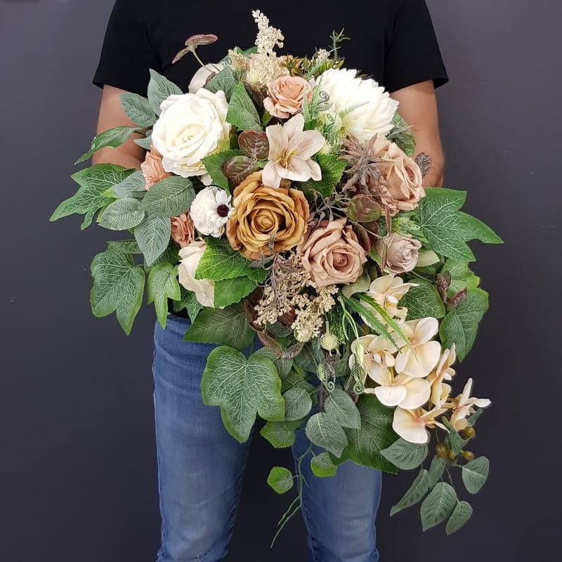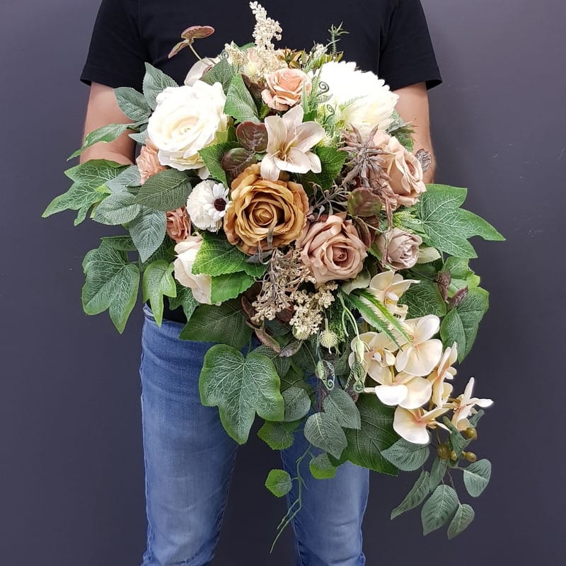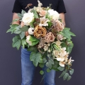 Kompozycja na płytę z przewagą kremu, brązu, cappuccino, delikatnej brzoskwini, kolorystyce szarości, przybrudzonego beżu, przełamana naturalnymi brązami i wykończona spokojną zielenią. Całość jest niezwykle elegancka, spokojna i wyważona.