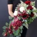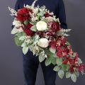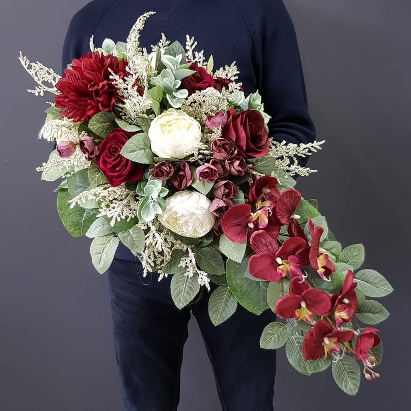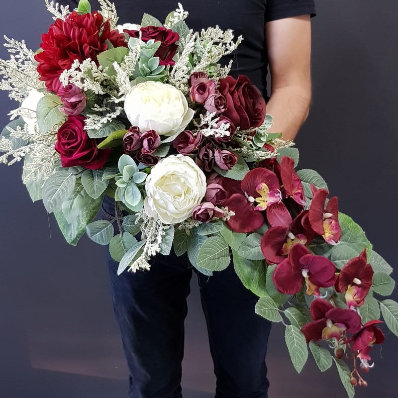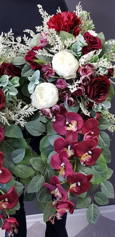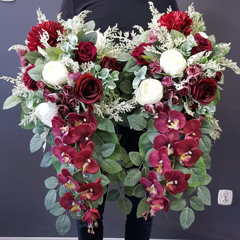 Kompozycja nagrobna w odcieniach głębokiej czerwieni, eleganckiego bordo, przełamana delikatnymi, kremowymi akcentami i uzupełniona pudrową zielenią liści. Całość prezentuje się niezwykle elegancko i stylowo. Klasyka w pełnym tego słowa znaczeniu. Kompozycja przeznaczona zarówno dla kobiety, jak i mężczyzny.
