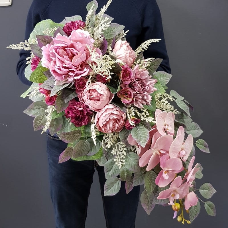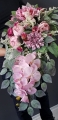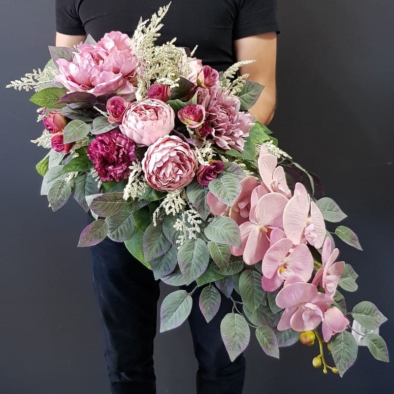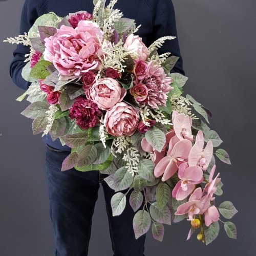 Kompozycja nagrobna w odcieniach stonowanego różu, przybrudzonej, pudrowej fuksji, pastelowego różu, przełamana delikatnymi, kremowo-zielonymi dodatkami, uzupełniona pudrową zielenią liści. Całość jest niezwykle elegancka i wyważona, ale nie pozbawiona wyrazu. Cudowny zestaw kwiatów pamięci dla wyjątkowej osoby...