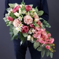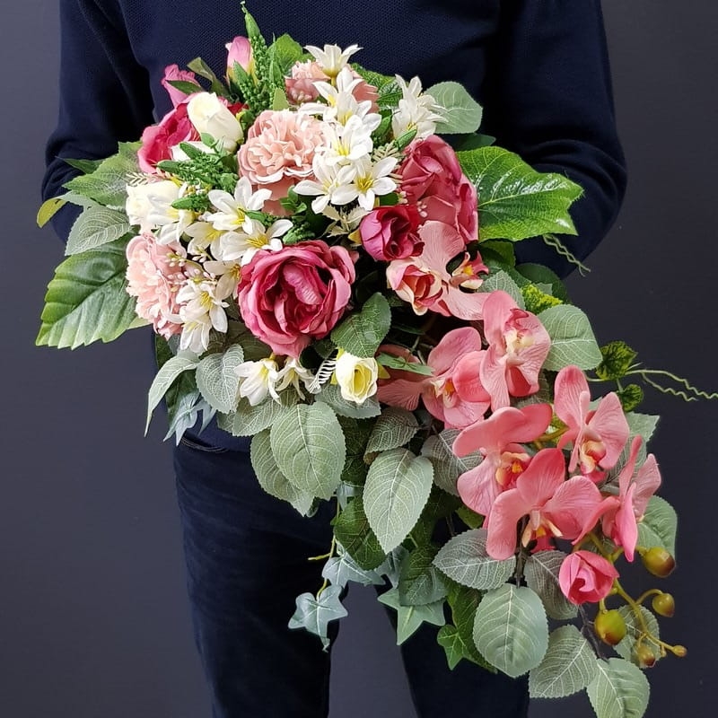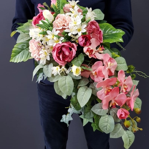 Kompozycja nagrobna w odcieniach stonowanego różu, przybrudzonej, pudrowej fuksji, pastelowego różu, przełamana delikatnymi, kremowo-zielonymi dodatkami, uzupełniona pudrową zielenią liści. Całość jest niezwykle elegancka i wyważona, ale nie pozbawiona wyrazu. Cudowny zestaw kwiatów pamięci dla wyjątkowej osoby...