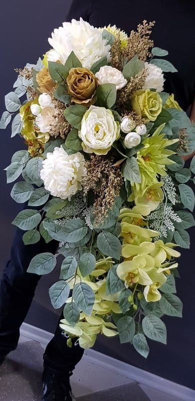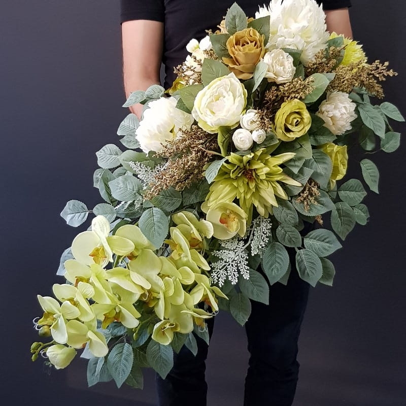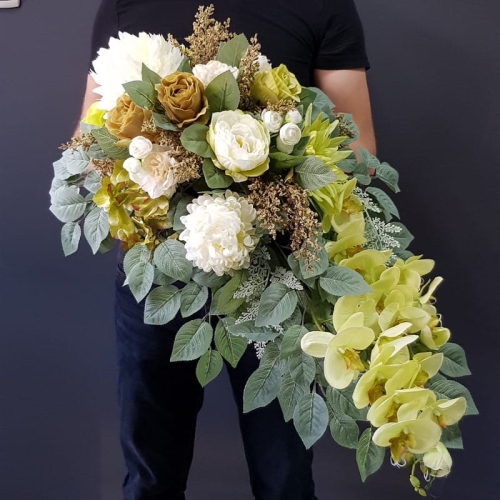 Kompozycja nagrobna w różnych odcieniach zieleni, delikatnego brązu, przełamana delikatnymi, kremowymi akcentami i uzupełniona pudrową zielenią liści. Całość jest niezwykle stylowa i mimo dość mocnych kolorów, spokojna i wyważona.