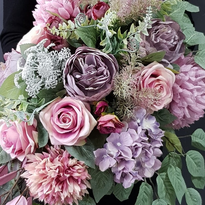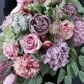 Kompozycja nagrobna w odcieniach brudnego różu, przełamana delikatnymi, kremowymi akcentami. Całość jest niezwykle elegancka, spokojna i wyważona. Kompozycja wykonana w donicy z tworzywa, obciążonej betonem, umieszczona na okrągłej podstawie.
