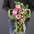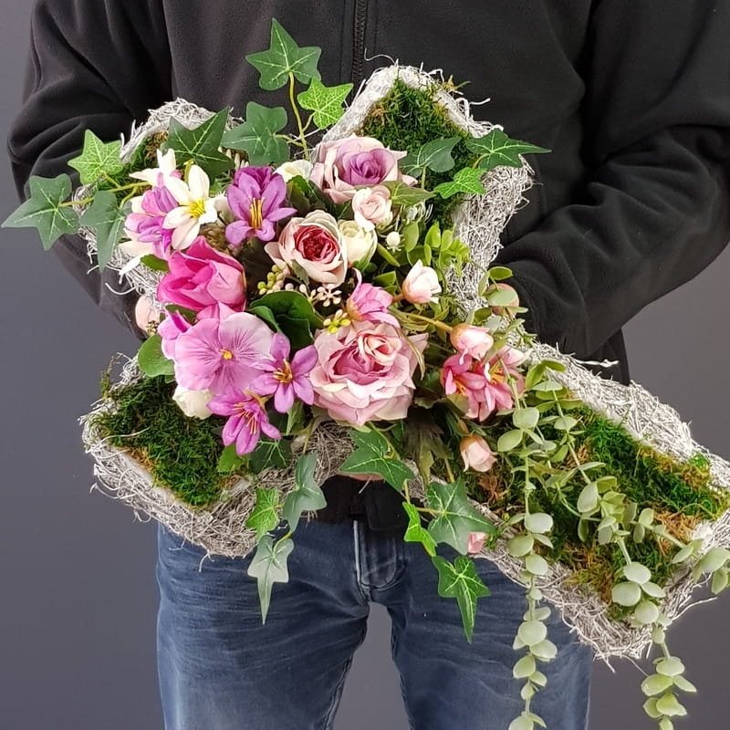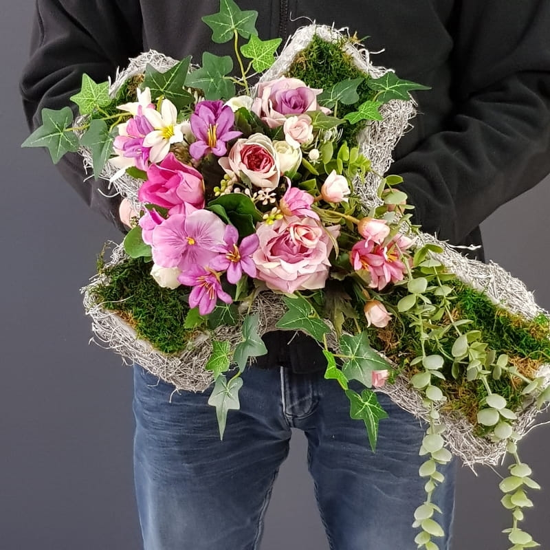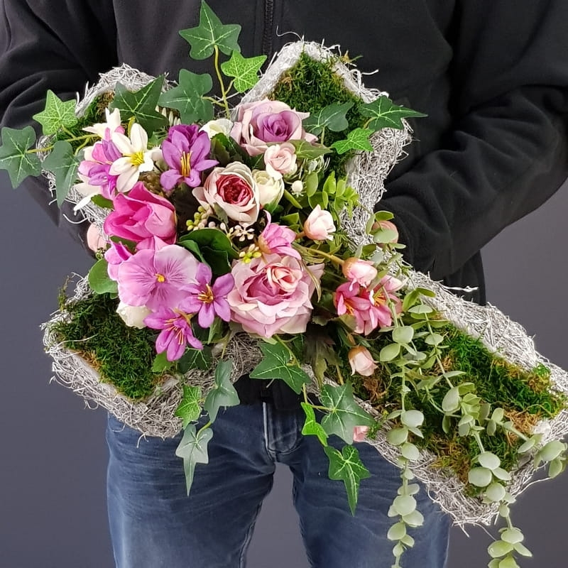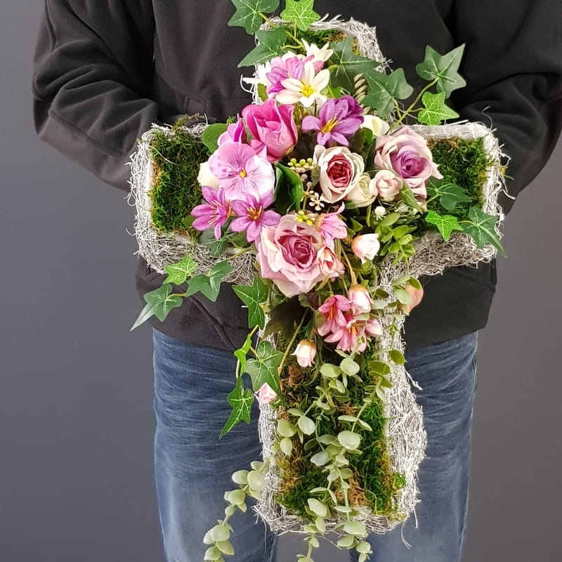 Oryginalna kompozycja nagrobna w kształcie krzyża, wykonana z wysokiej jakości roślin sztucznych oraz podstawy z faszyny. Pięknie będzie się prezentowała na grobie osoby dorosłej lub dziecka. Kompozycja jest obciążona cementem, jest ciężka i stabilna. Prezentuje się naprawdę wyjątkowo i oryginalnie. Szczególnego uroku dodaje jej zwisający eukaliptus wychodzący poza stroik, który należy ułożyć na samej płycie nagrobka.