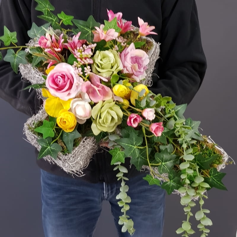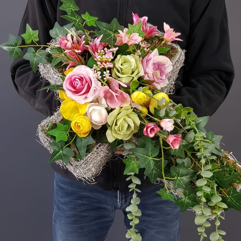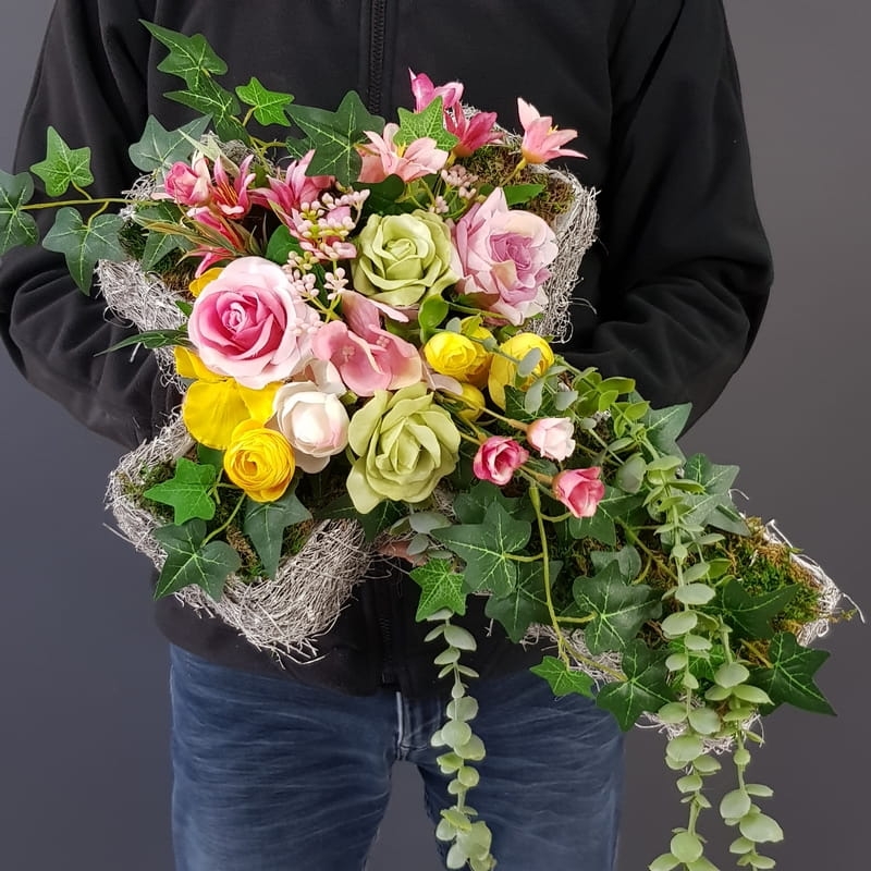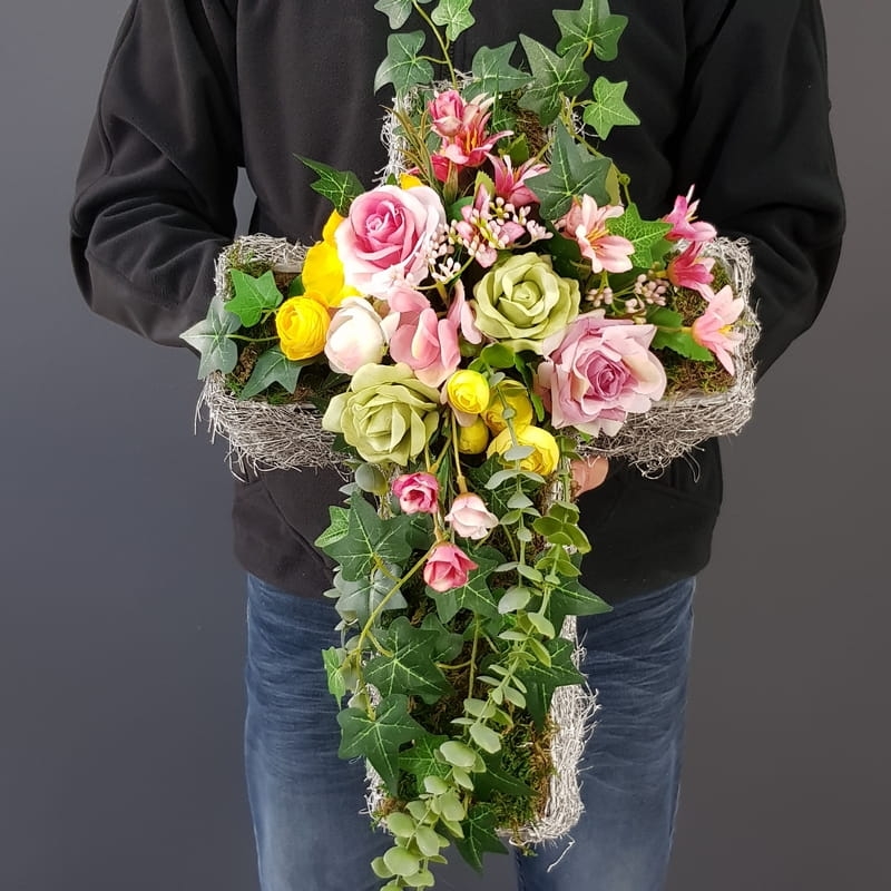Oryginalna kompozycja nagrobna w kształcie krzyża, wykonana z wysokiej jakości roślin sztucznych oraz podstawy z faszyny. Pięknie będzie się prezentowała na grobie osoby dorosłej lub dziecka. Kompozycja jest obciążona cementem, jest ciężka i stabilna. Prezentuje się naprawdę wyjątkowo i oryginalnie. Szczególnego uroku dodaje jej zwisający eukaliptus wychodzący poza stroik, który należy ułożyć na samej płycie nagrobka.