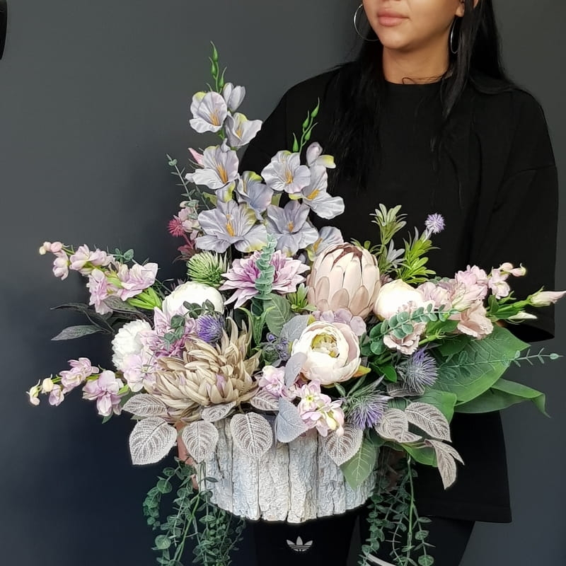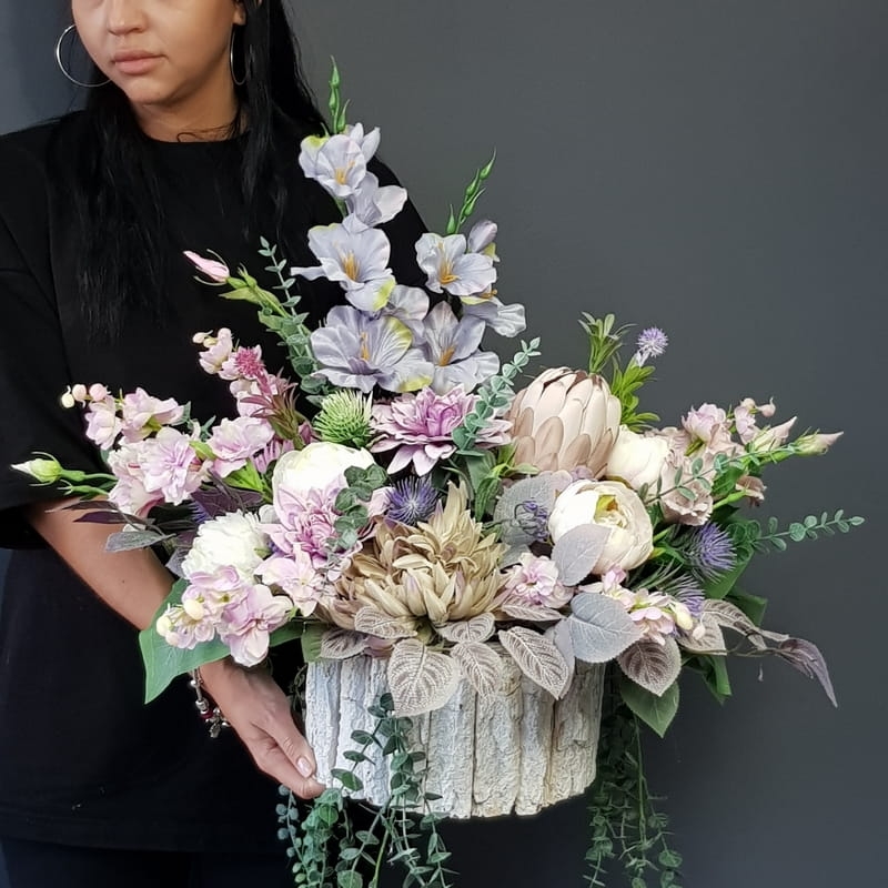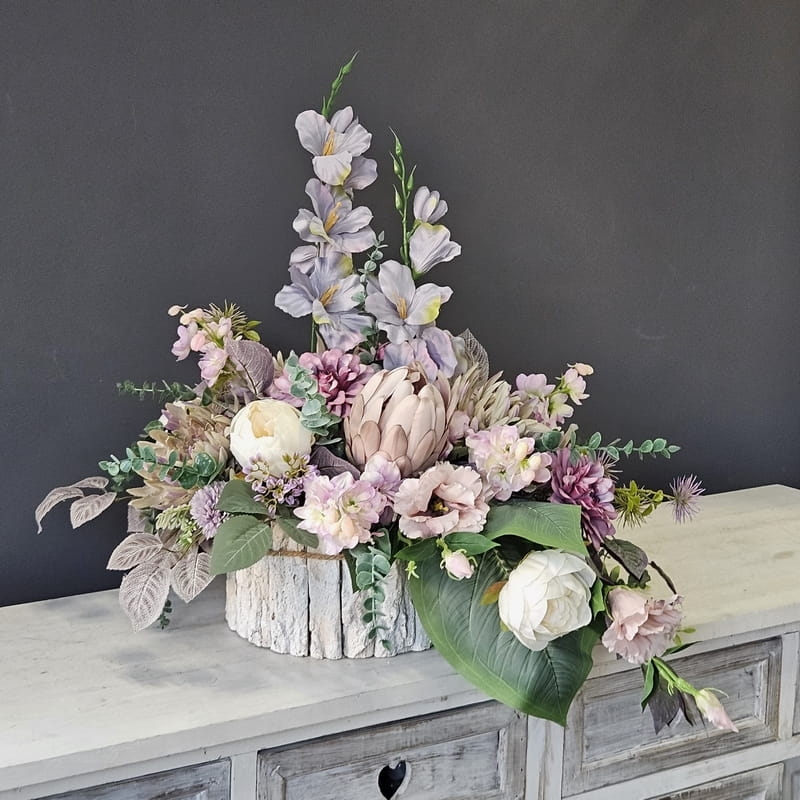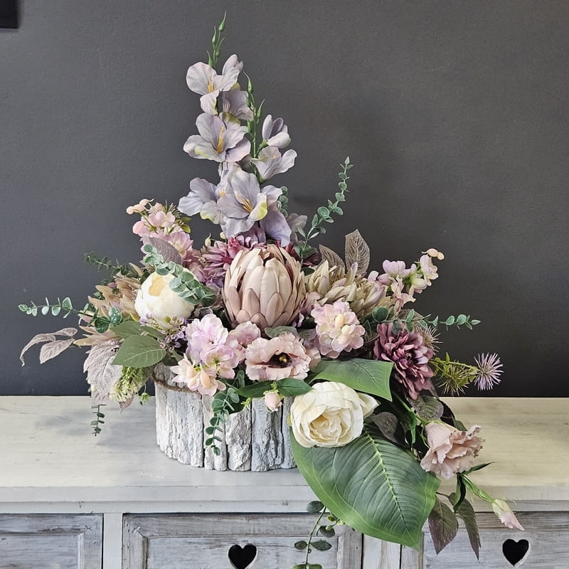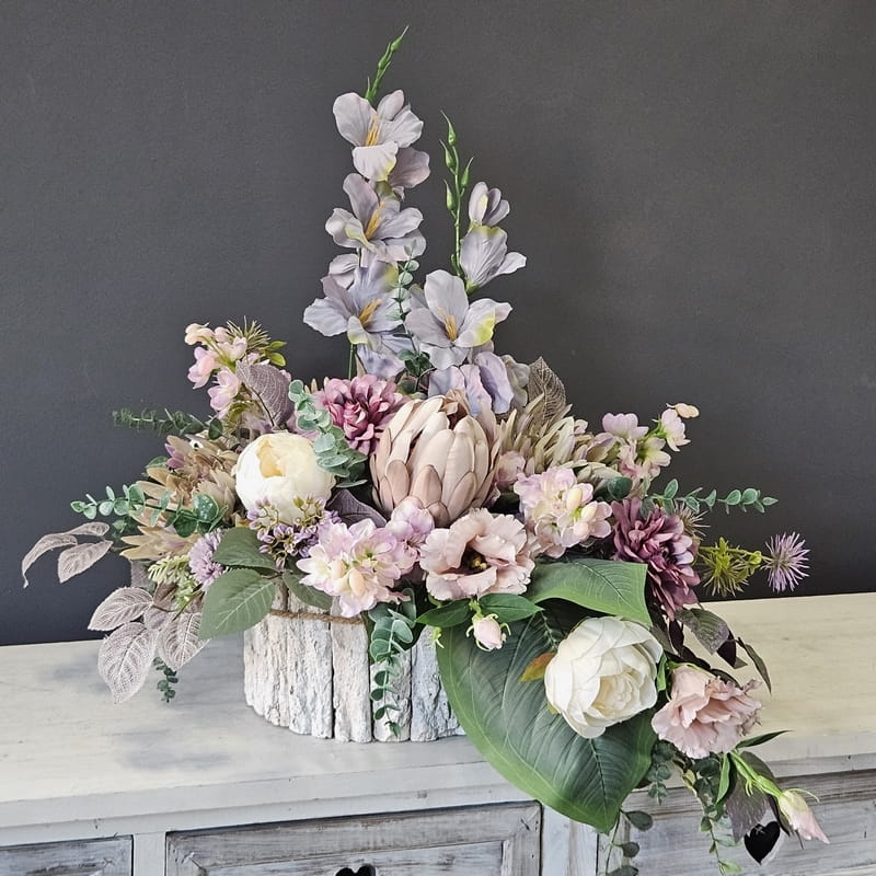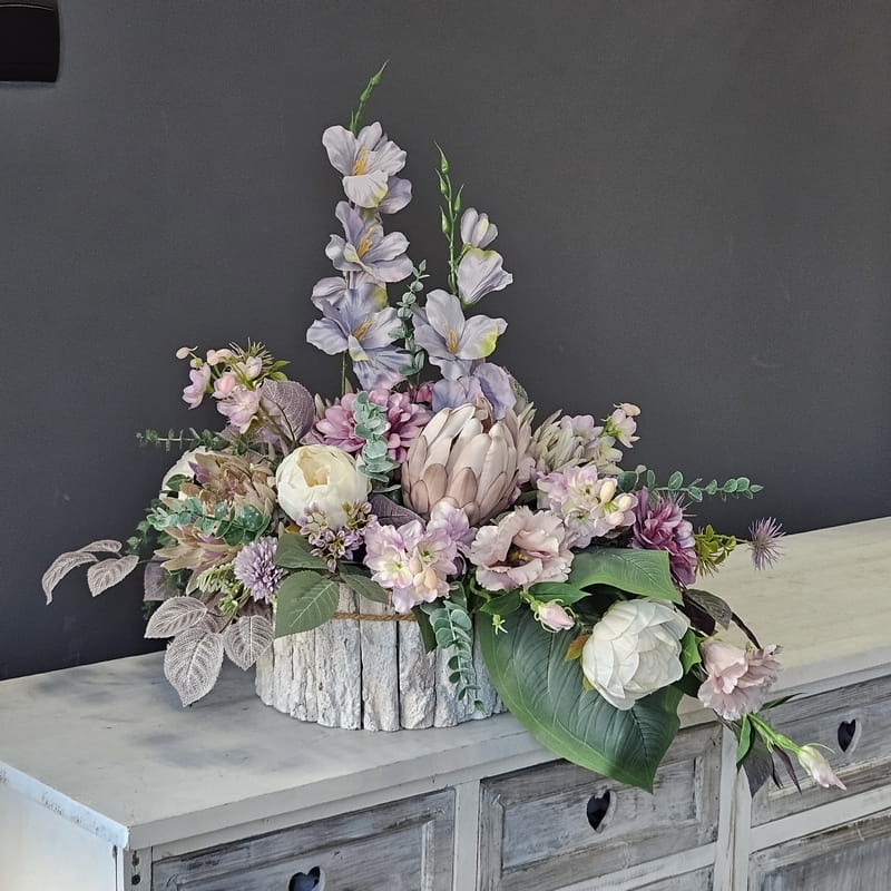 Oryginalna dekoracja nagrobna w stonowanej kolorystyce i asymetrycznej formie, gotowa do postawienia na płytę nagrobkową. Całość osadzona w obciążonej cementem donicy z kory. Kompozycja jest stworzona z dbałością o najdrobniejszy szczegół. Wszystkie elementy są idealnie dopasowane kolorystycznie tak, aby tworzyły spójną całość. Poszczególne kompozycje mogą minimalnie różnić się rozkładem i rodzajami kwiatów, w zależności od dostępności, jednak kolorystyka i efekt końcowy są zawsze zachowane.