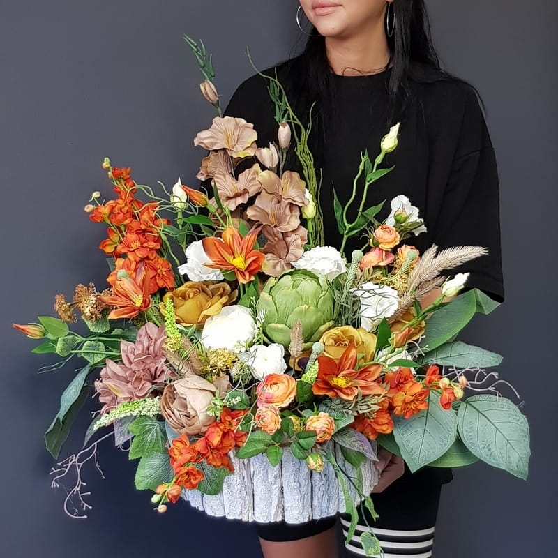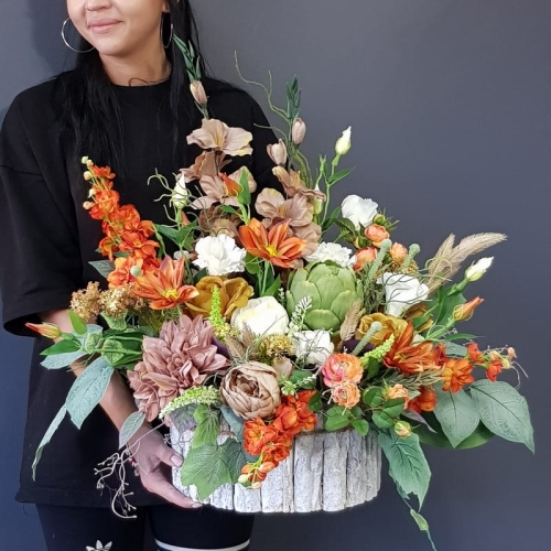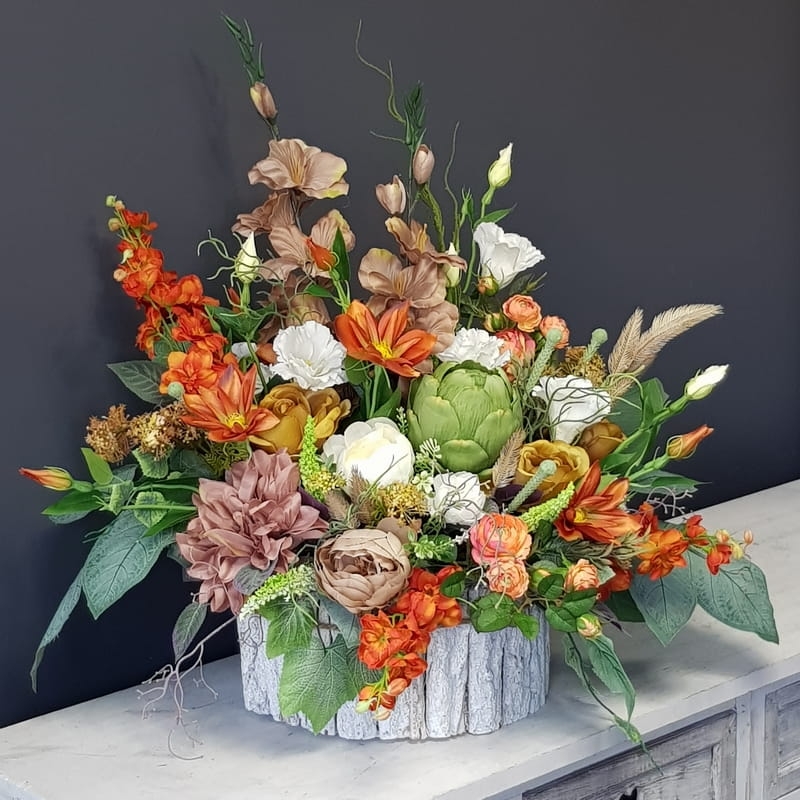 Oryginalna dekoracja nagrobna w jesiennej kolorystyce. Bardzo bogata w kwiaty i dodatki. Całość osadzona w obciążonej cementem donicy z kory. Kompozycja jest stworzona z dbałością o najdrobniejszy szczegół. Wszystkie elementy są idealnie dopasowane kolorystycznie tak, aby tworzyły spójną całość. Poszczególne kompozycje mogą minimalnie różnić się rozkładem i rodzajami kwiatów, w zależności od dostępności, jednak kolorystyka i efekt końcowy są zawsze zachowane.