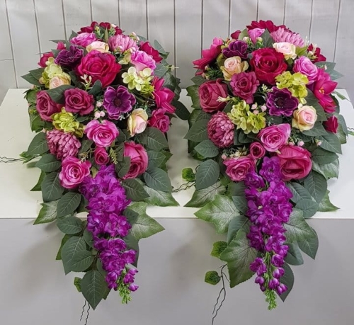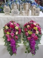 Oryginalna kompozycja nagrobna w kształcie wydłużonej kropli, wykonana z wysokiej jakości roślin sztucznych w letnich kolorach.