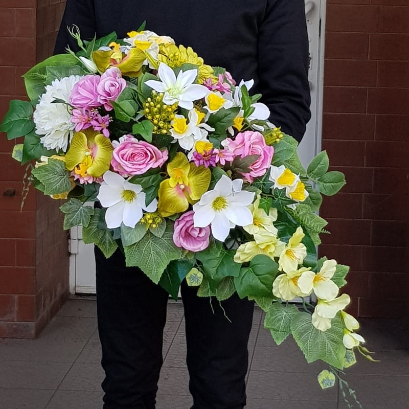 Oryginalna kompozycja nagrobna w kształcie wydłużonej kropli, wykonana z wysokiej jakości roślin sztucznych w letnich kolorach. Podstawę stanowi donica z tworzywa sztucznego obciążona cementem. Kompozycja jest ciężka i stabilna. Prezentuje się naprawdę wyjątkowo i oryginalnie. To zupełnie inna jakość niż typowe cmentarne stroiki. Szczególnego uroku dodaje jej zwisający eukaliptus wychodzący poza stroik, który należy ułożyć na samej płycie nagrobka. Długość kompozycji bez zwisającej rośliny ok.60-70cm.