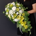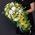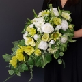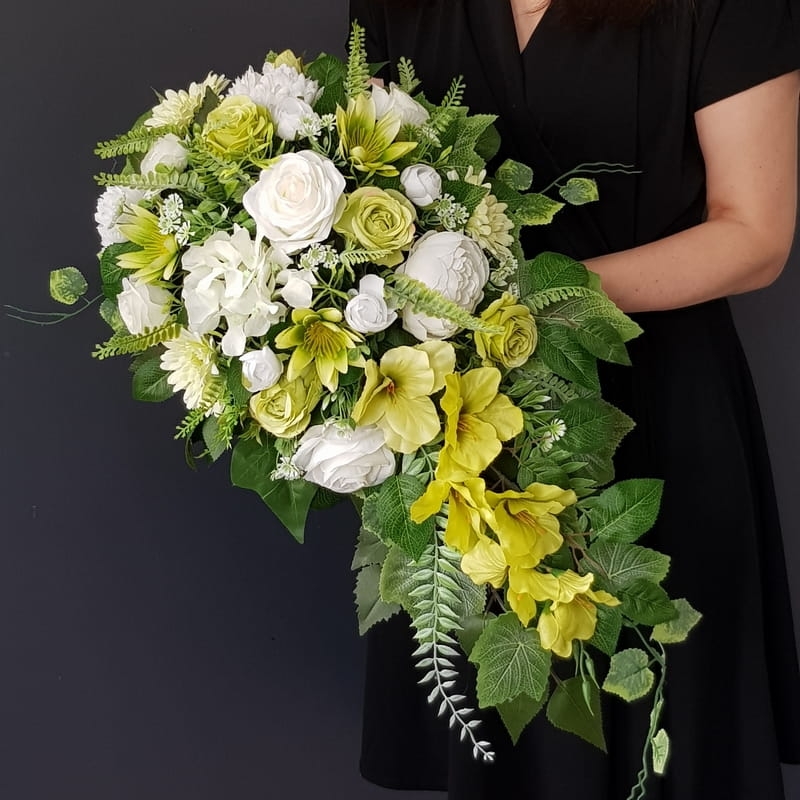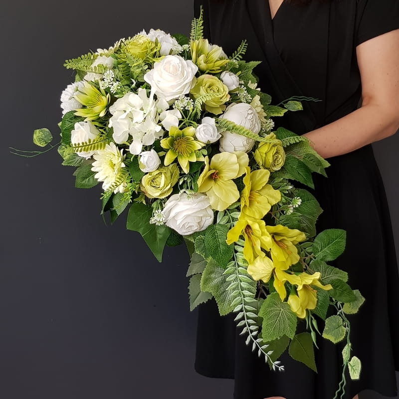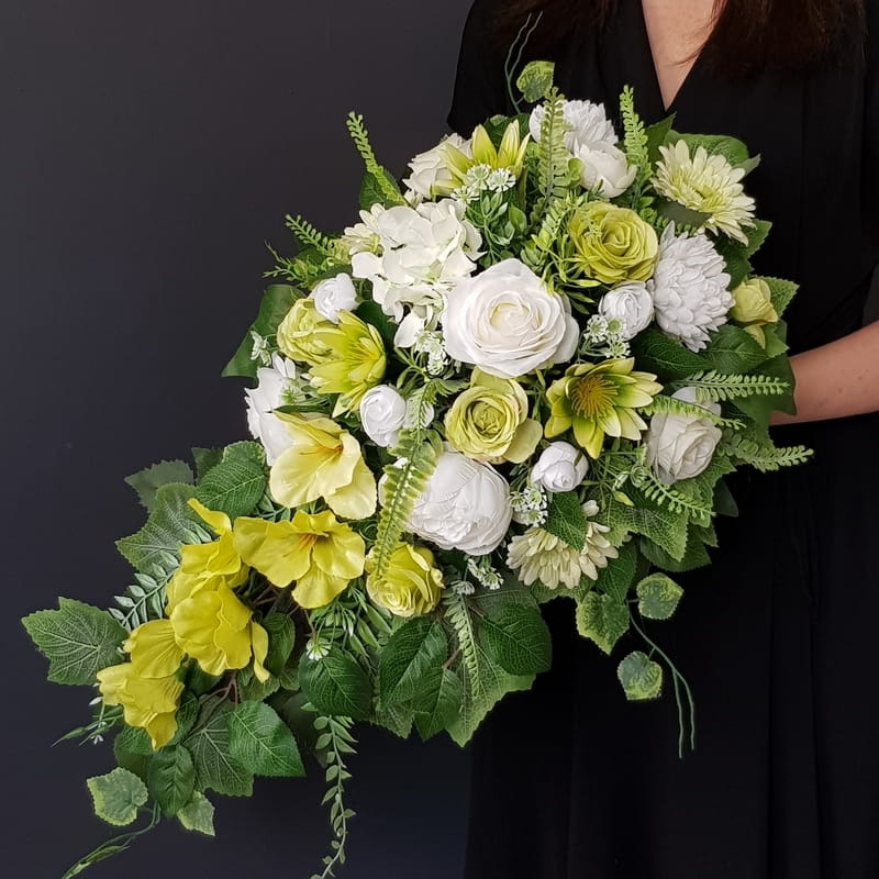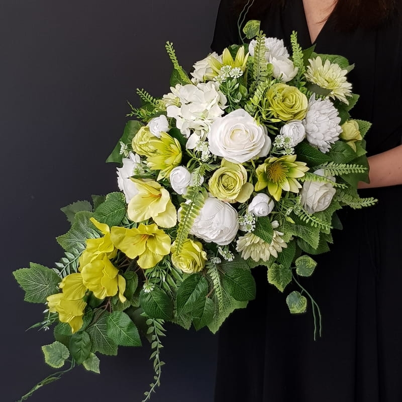 Postawa wykonana z tworzywa sztucznego,wypełniona dużą ilością kwiatów, liści i roślinnych dodatków w przepięknej, stonowanej kolorystyce. Kompozycja ma kształt kropli. Jest wydłużona jednostronnie. Dominują kwiaty w stonowanej kolorystyce oraz liście w pastelowej zieleni. Poszczególne kompozycje mogą się różnić rozkładem i rodzajami kwiatów, w zależności od dostępności, jednak kolorystyka i efekt końcowy są zawsze zachowane.