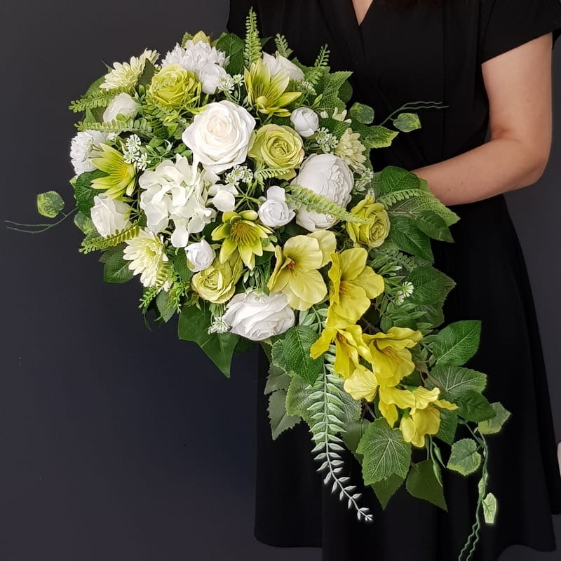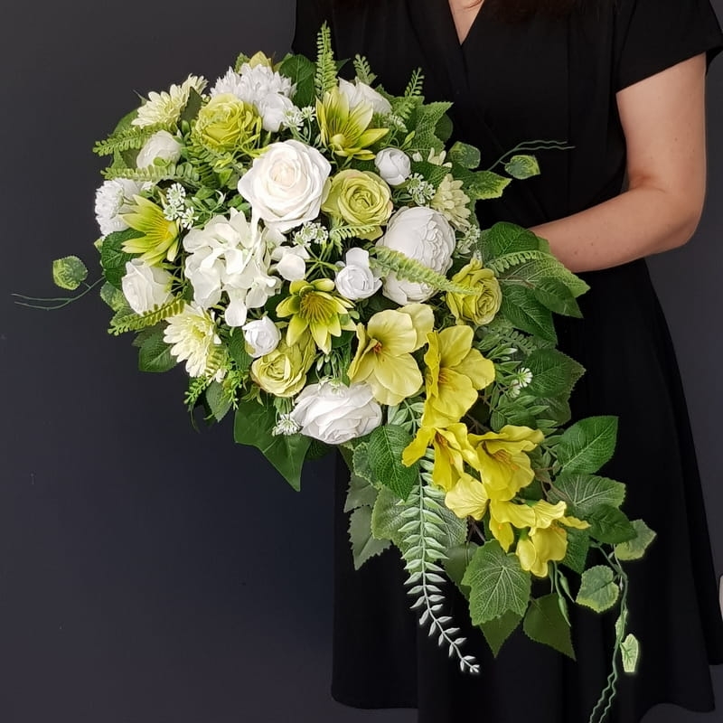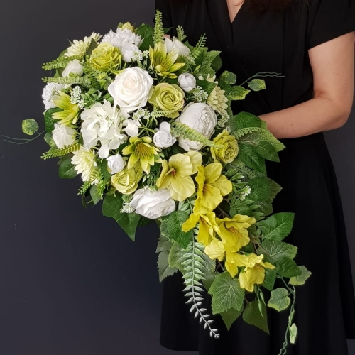 Oryginalna kompozycja nagrobna w kształcie wydłużonej kropli, wykonana z wysokiej jakości roślin sztucznych w letnich kolorach.