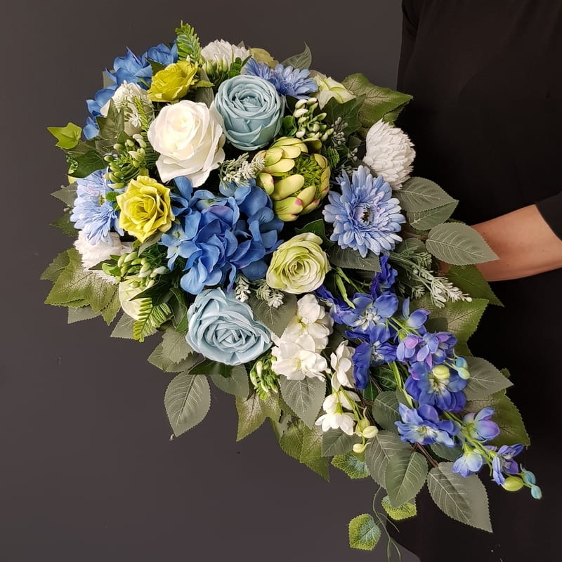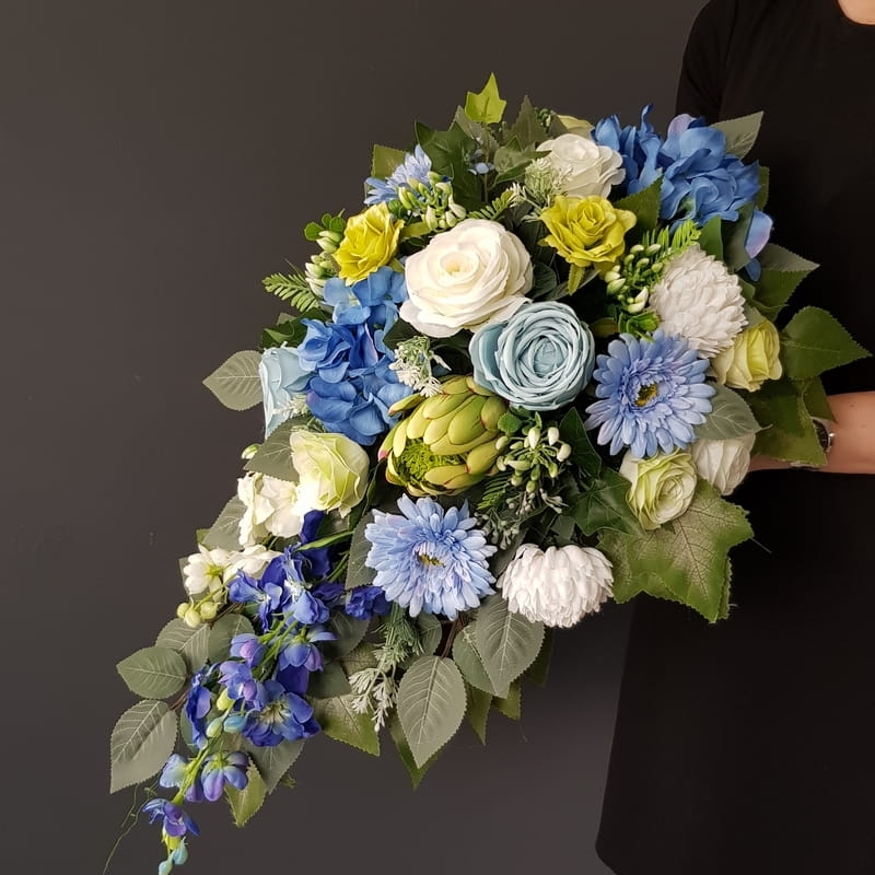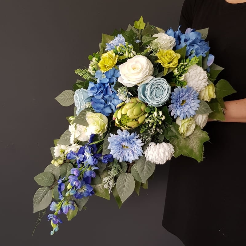 Oryginalna kompozycja nagrobna w kształcie wydłużonej kropli, wykonana z wysokiej jakości roślin sztucznych w letnich kolorach.