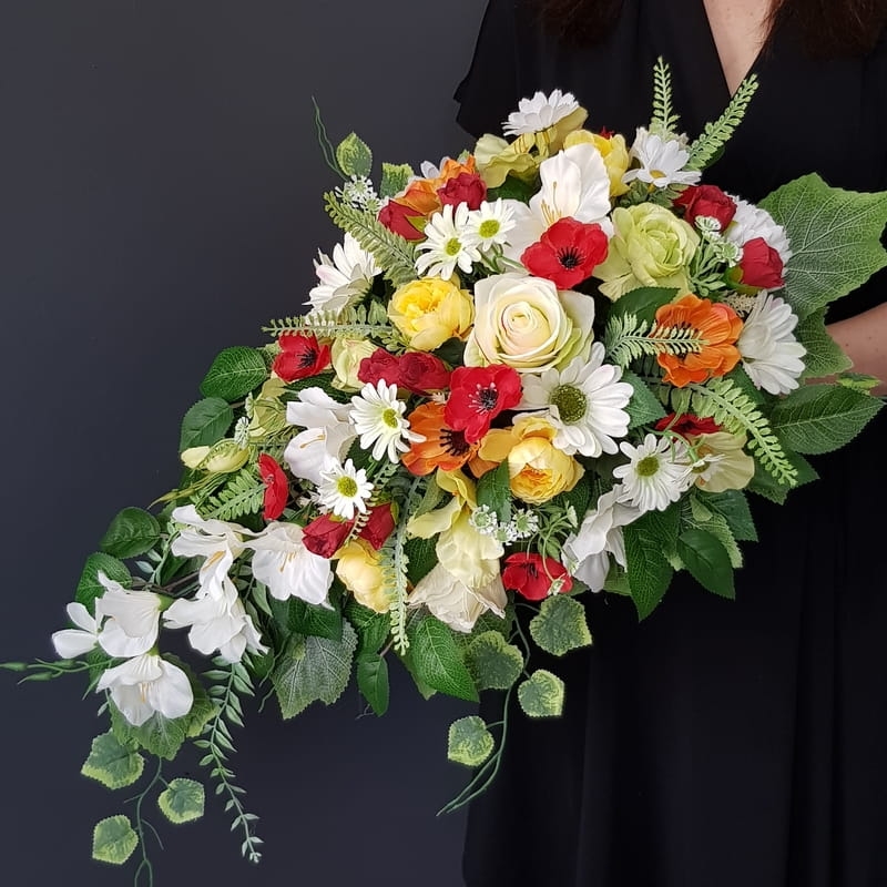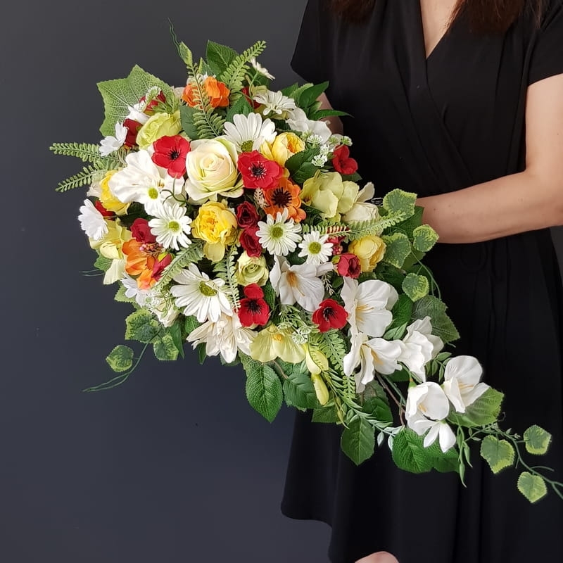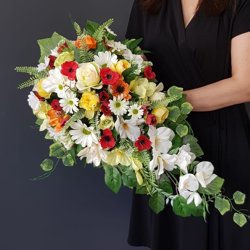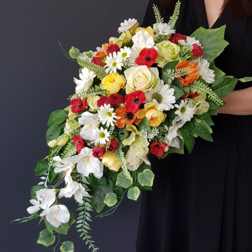 Oryginalna kompozycja nagrobna w kształcie wydłużonej kropli, wykonana z wysokiej jakości roślin sztucznych w letnich kolorach.