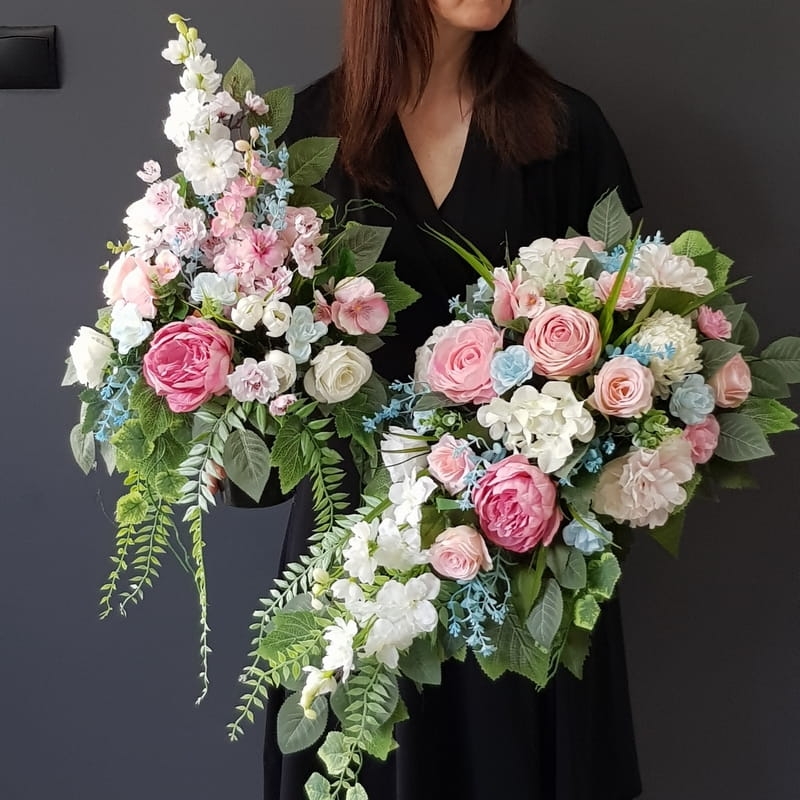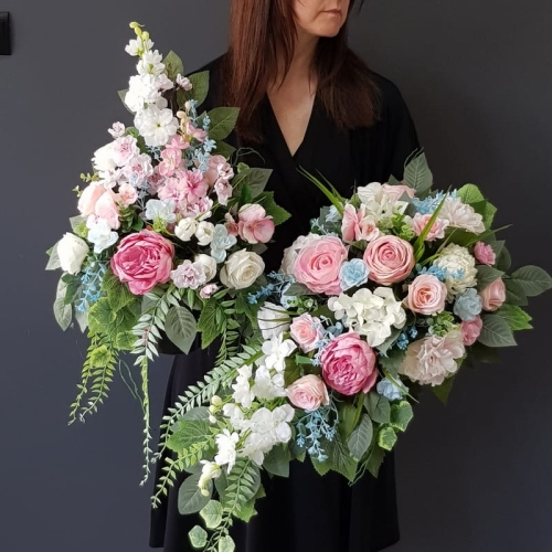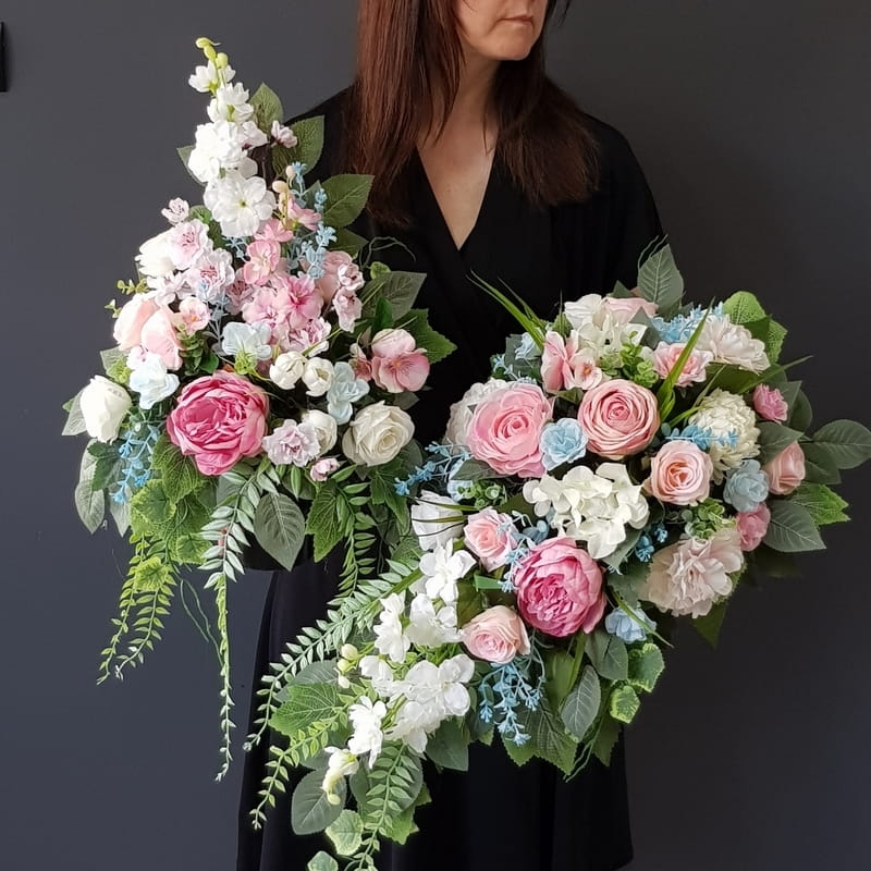 Postawa wykonana z tworzywa sztucznego,wypełniona dużą ilością kwiatów, liści i roślinnych dodatków w przepięknej, stonowanej kolorystyce. Kompozycja ma kształt kropli. Jest wydłużona jednostronnie. Dominują kwiaty w stonowanej kolorystyce oraz liście w pastelowej zieleni. Poszczególne kompozycje mogą się różnić rozkładem i rodzajami kwiatów, w zależności od dostępności, jednak kolorystyka i efekt końcowy są zawsze zachowane.
