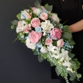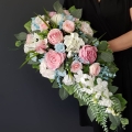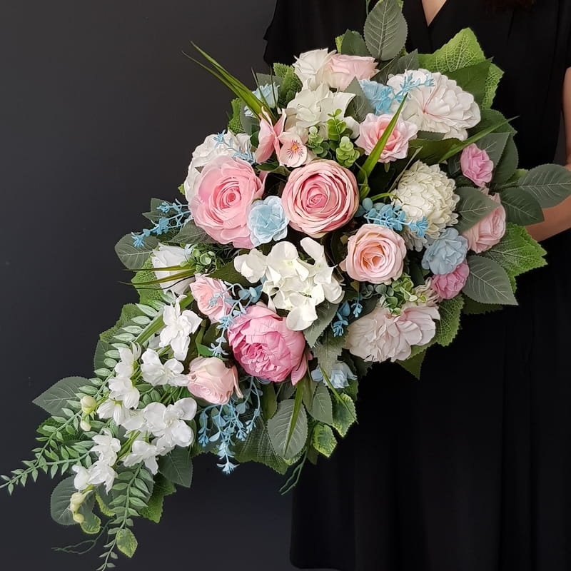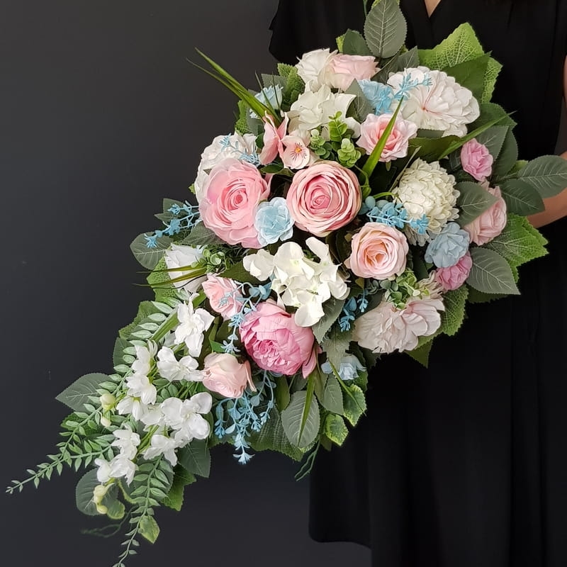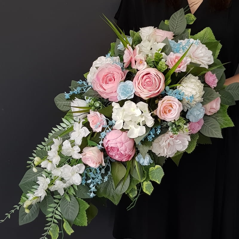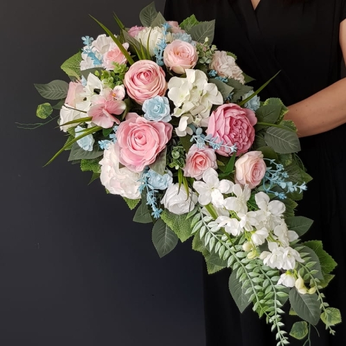 Postawa wykonana z tworzywa sztucznego,wypełniona dużą ilością kwiatów, liści i roślinnych dodatków w przepięknej, stonowanej kolorystyce. Kompozycja ma kształt kropli. Jest wydłużona jednostronnie. Dominują kwiaty w stonowanej kolorystyce oraz liście w pastelowej zieleni. Poszczególne kompozycje mogą się różnić rozkładem i rodzajami kwiatów, w zależności od dostępności, jednak kolorystyka i efekt końcowy są zawsze zachowane.