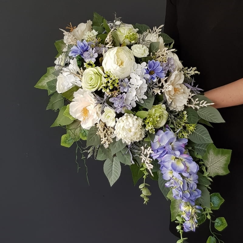 Oryginalna kompozycja nagrobna w kształcie wydłużonej kropli, wykonana z wysokiej jakości roślin sztucznych w letnich kolorach.