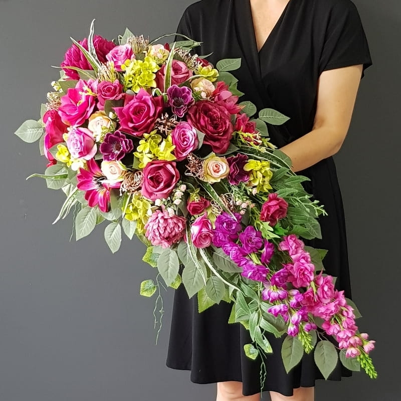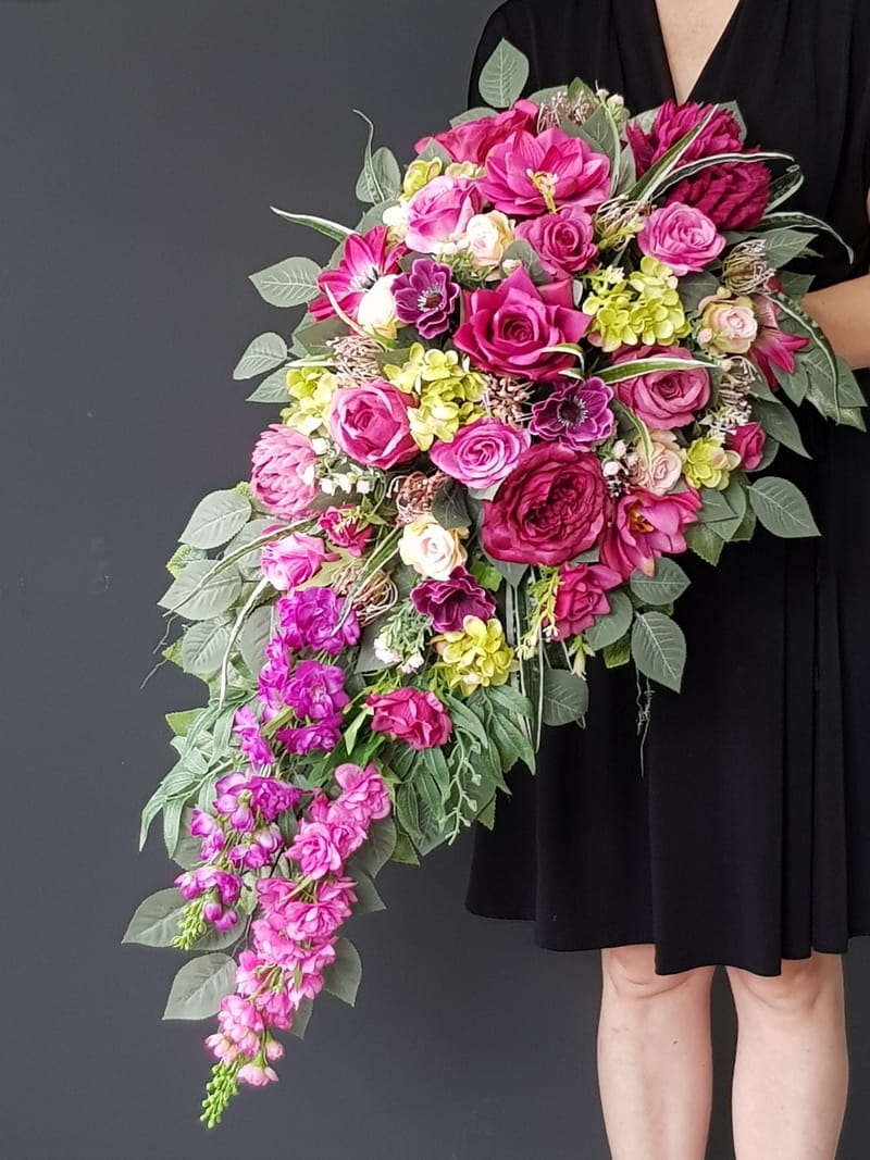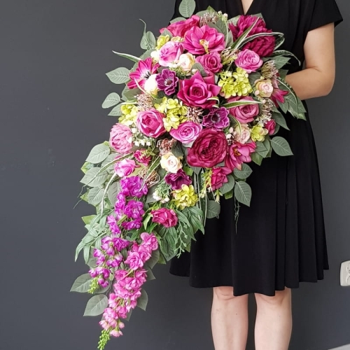 Oryginalna kompozycja nagrobna w kształcie wydłużonej kropli, wykonana z wysokiej jakości roślin sztucznych w letnich kolorach.